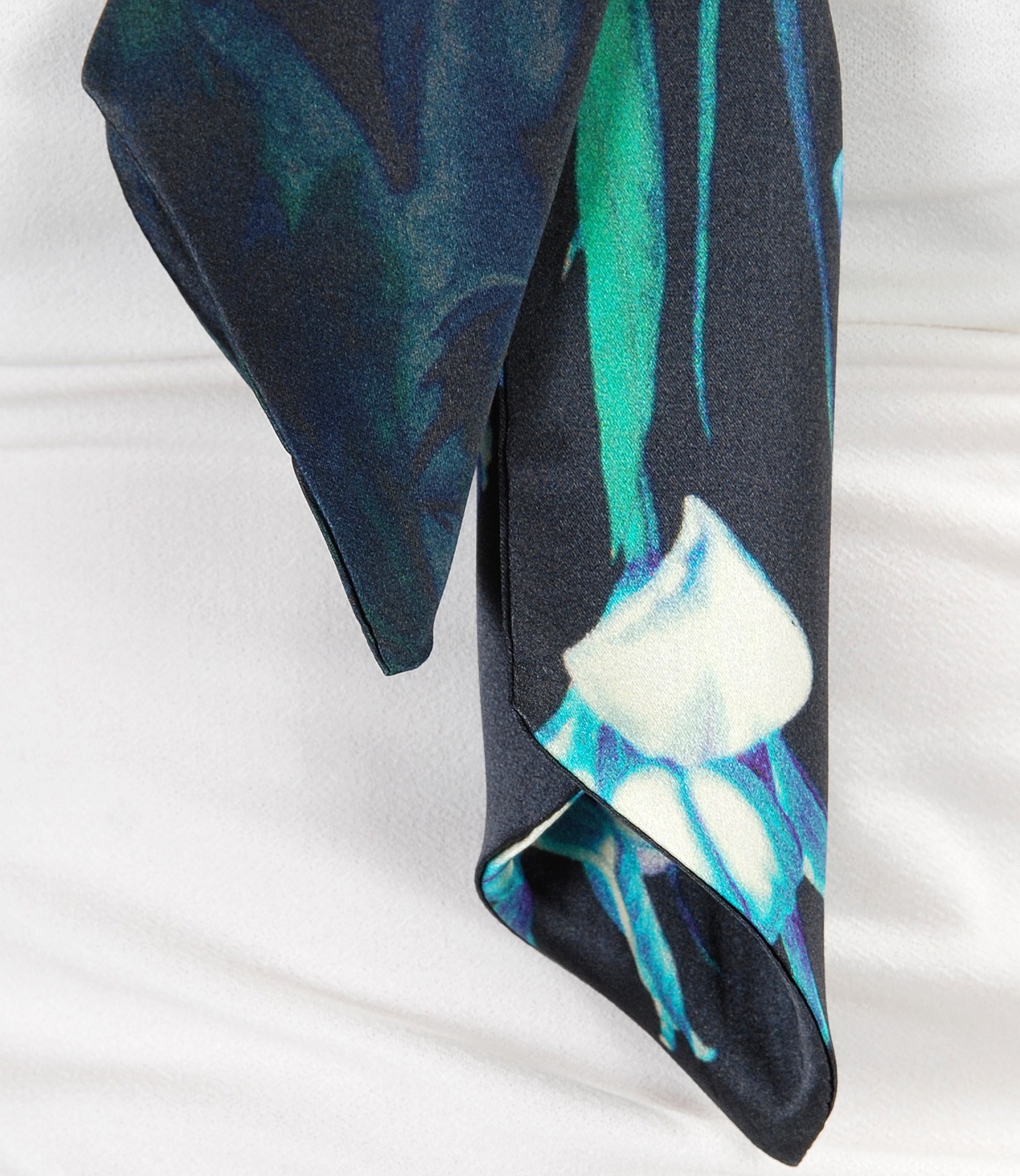 Esarfa din matase naturala elastica imprimata cu motive florale, dublata, de forma dreptunghiulara, cu capete ascutite.