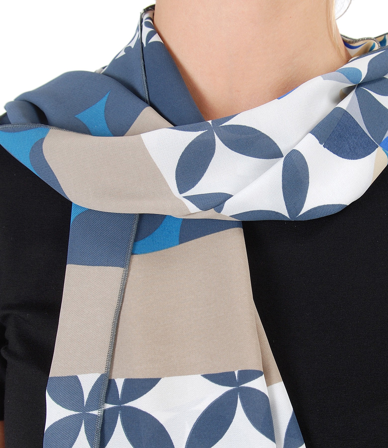 Esarfa imprimata cu motive geometrice, de forma dreptunghiulara.