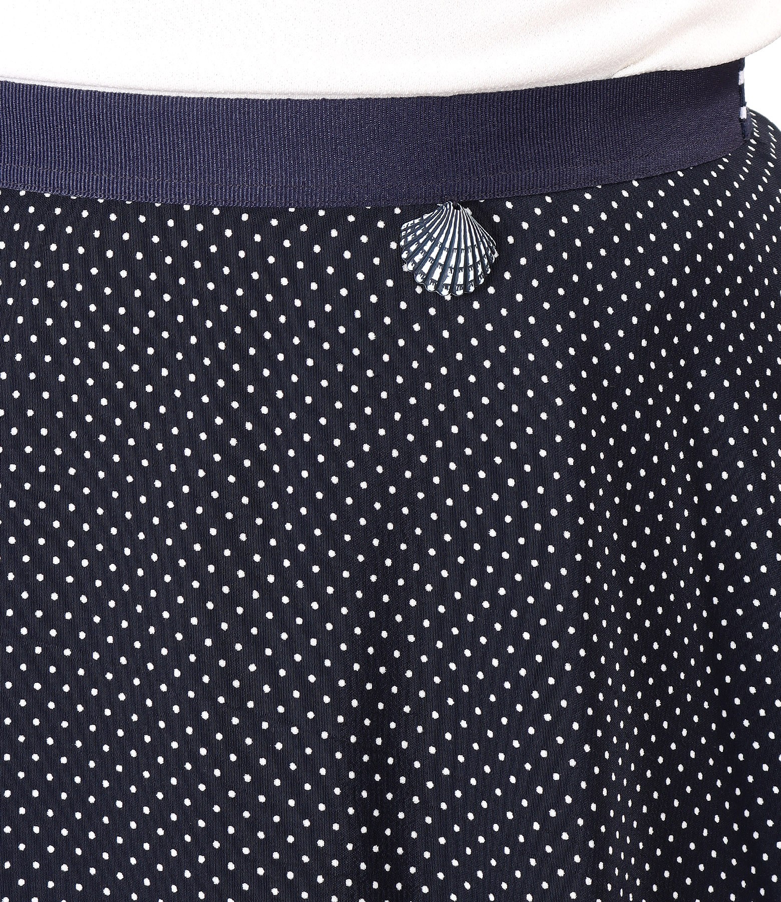 Fusta clos, necaptusita, din viscoza imprimata cu picouri, cu elastic in talie si scoica decorativa cusuta in talie. Se inchide cu fermoar ascunt pe mijloc spate.