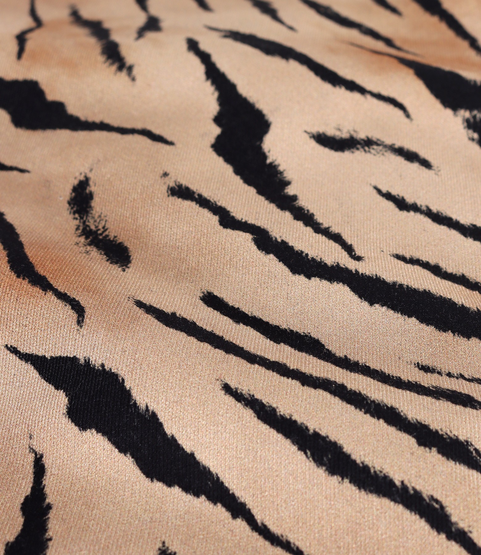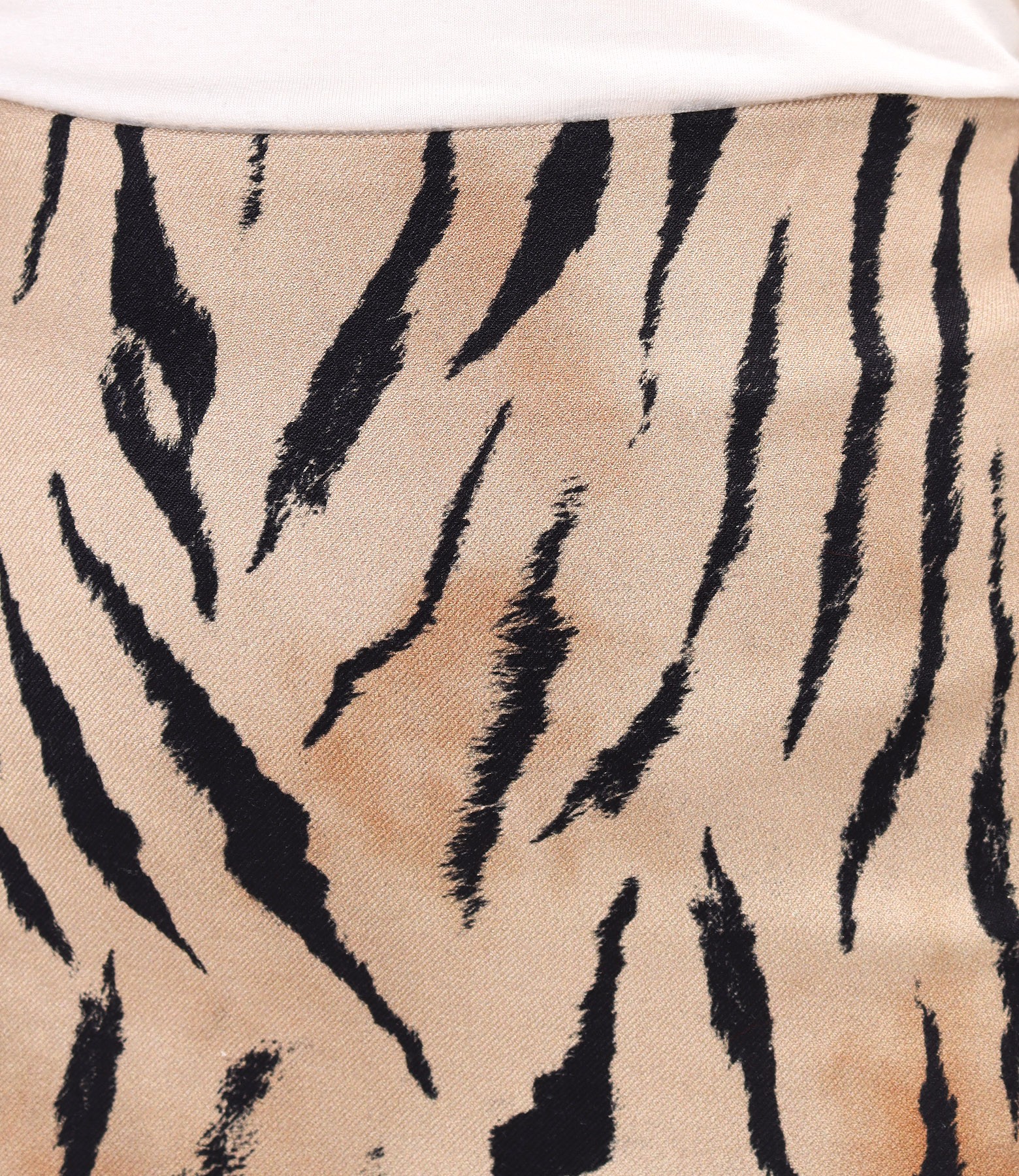 Fusta conica din viscoza cu lana virgina, imprimata, cu insertie de saten negru pe laterale si cu slit pe mijloc spate. Se inchide cu fermoar ascuns pe mijloc spate.