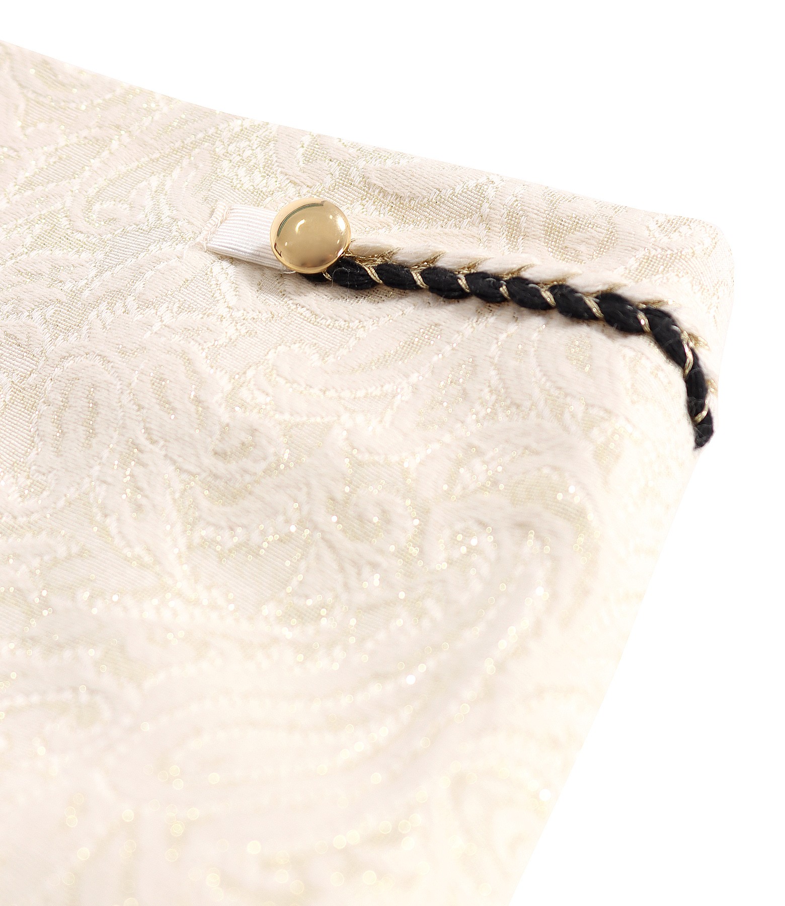 Fusta creion din brocart cu bumbac si fir de efect auriu, captusita, cu pasmanterie in talie si cu slit petrecut pe mijloc spate. Se inchide cu fermoar ascuns pe mijloc spate.