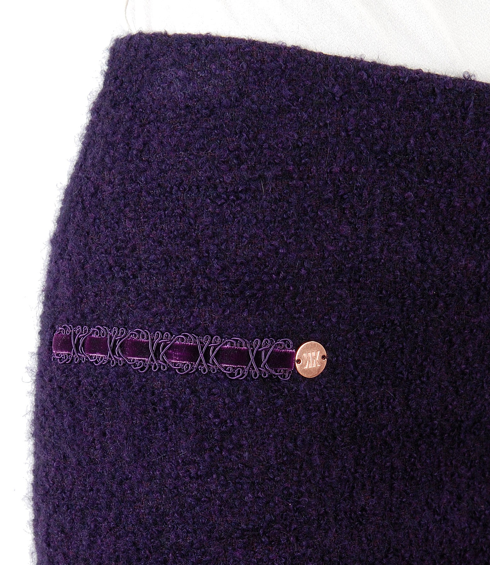 Fusta din bucle cu lana si alpaca, captusita, cu banda din catifea pe fata si cu slit petrecut pe mijloc spate. Se inchide cu fermoar ascuns pe mijloc spate.