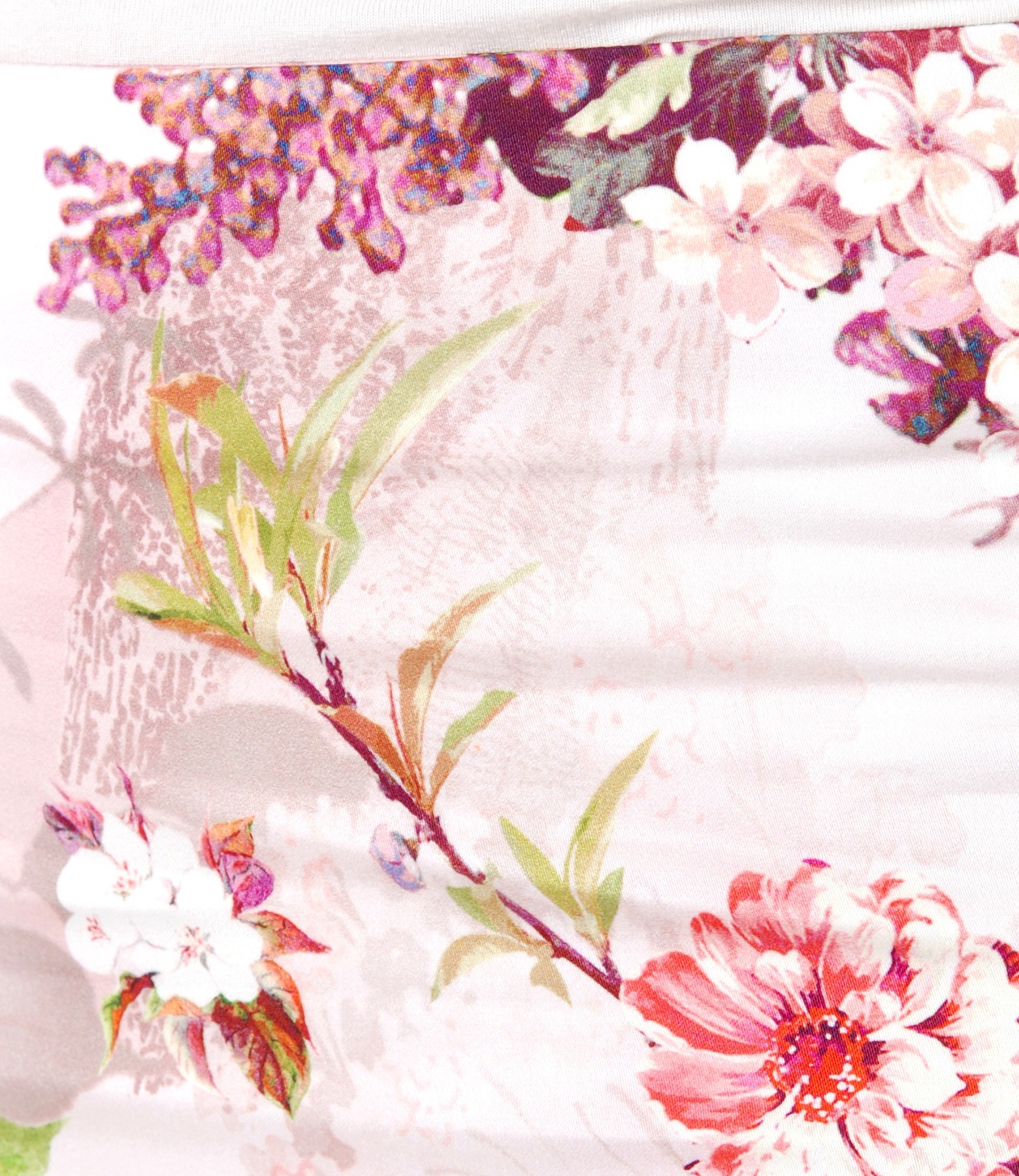 Fusta conica din bumbac elastic imprimat cu motive florale, necaptusita. Slit inchis cu fermoar ascuns. Se inchide cu fermoar ascuns pe mijloc spate.
