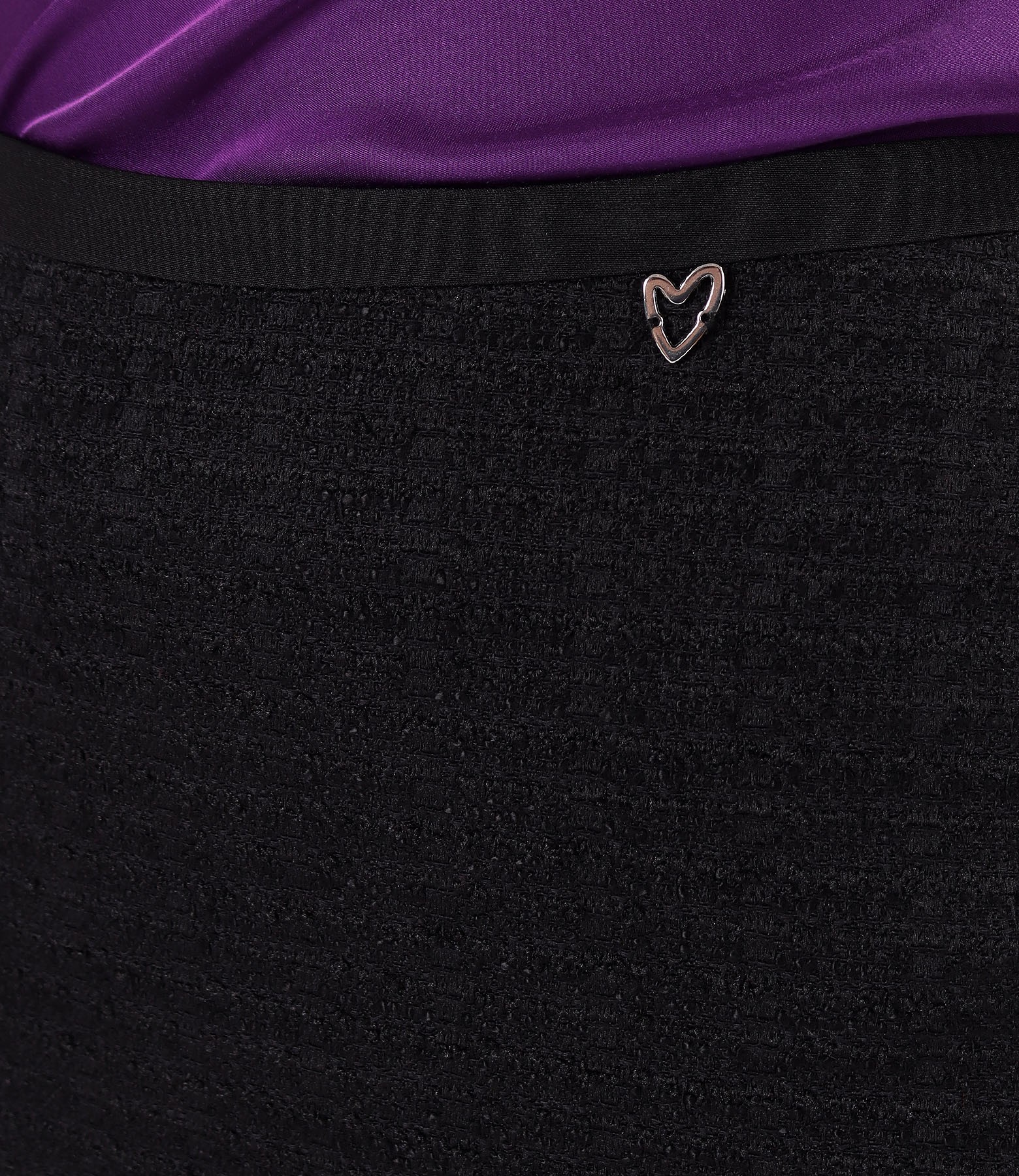 Fusta eleganta din bucle cu viscoza si bumbac, captusita, cu cordon in talie si element decorativ, si cu slit petrecut pe mijloc spate. Se inchide cu fermoar ascuns pe mijloc spate.
