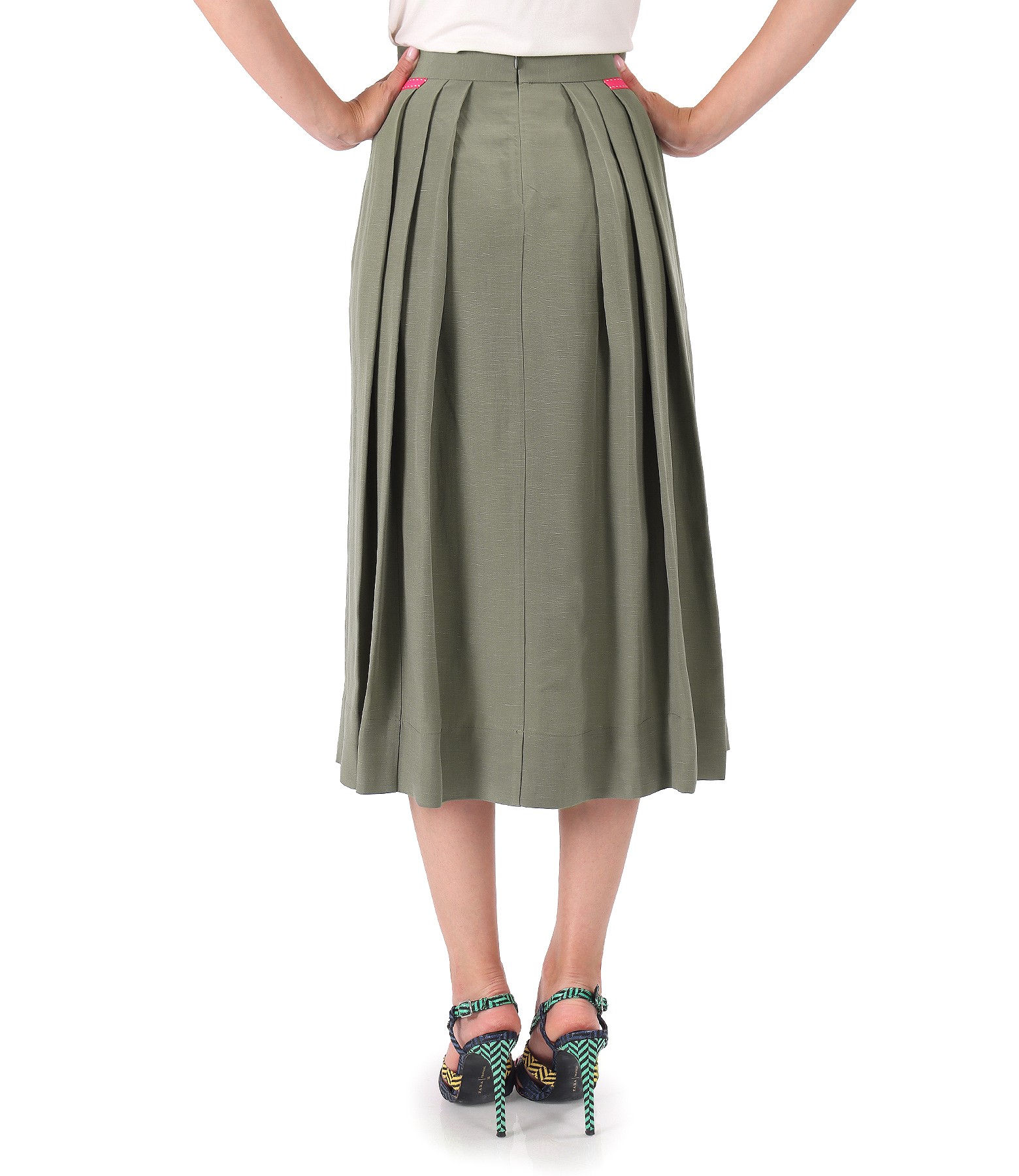 Fusta eleganta din tencel cu in, necaptusita, cu pliuri pe fata si pe spate, cu cordon lat in talie cu banda din rips cu cusatura decorativa in contrast si buzunare laterale. Se inchide cu fermoar ascusn pe mijloc spate.
