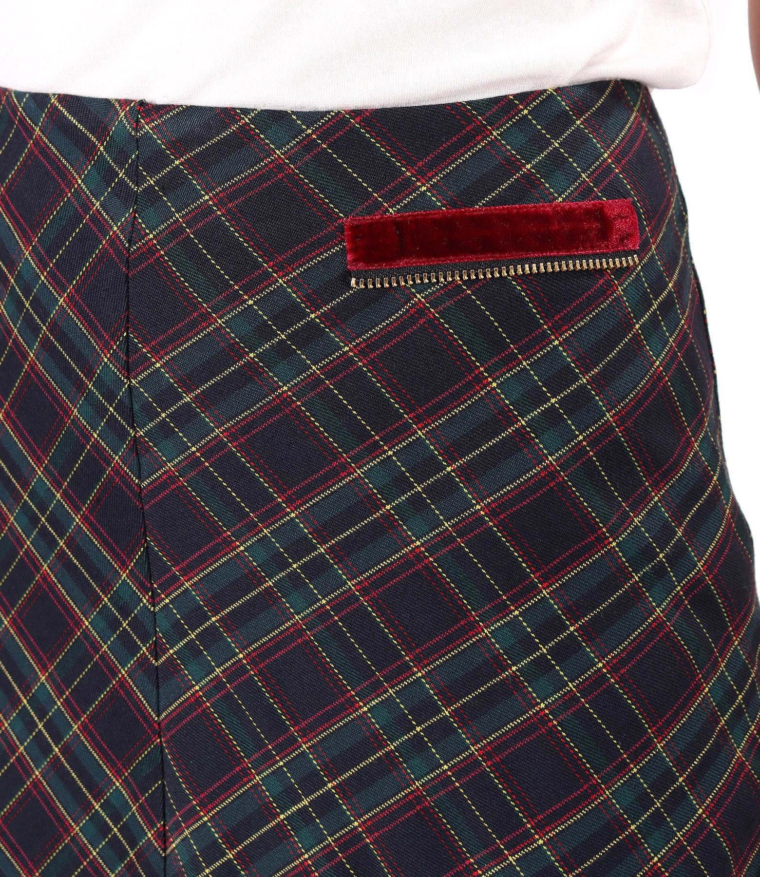 Fusta evazata din stofa cu viscoza in carouri si cu ornament din catifea in talie. Se inchide cu fermoar ascuns pe mijloc spate.