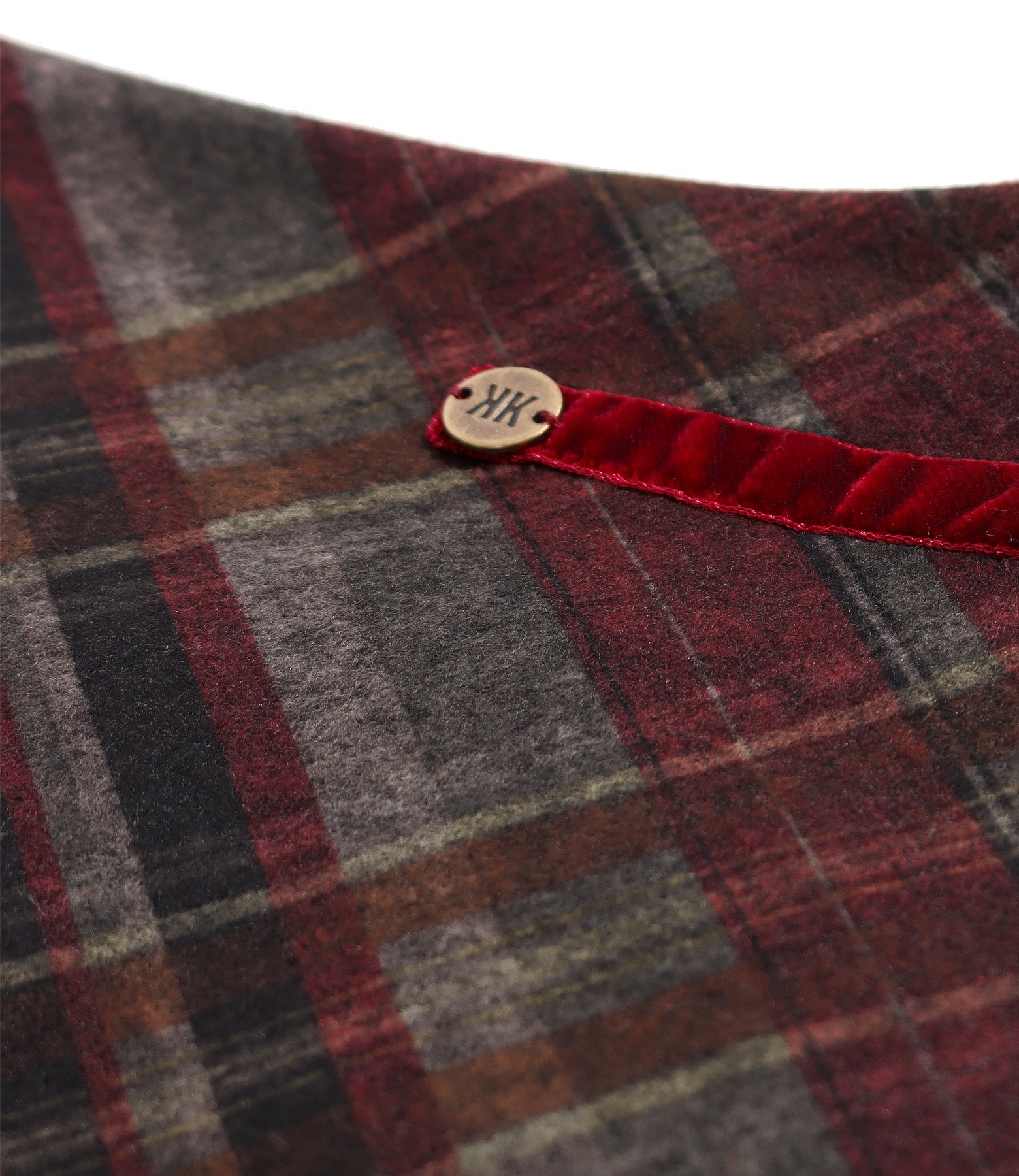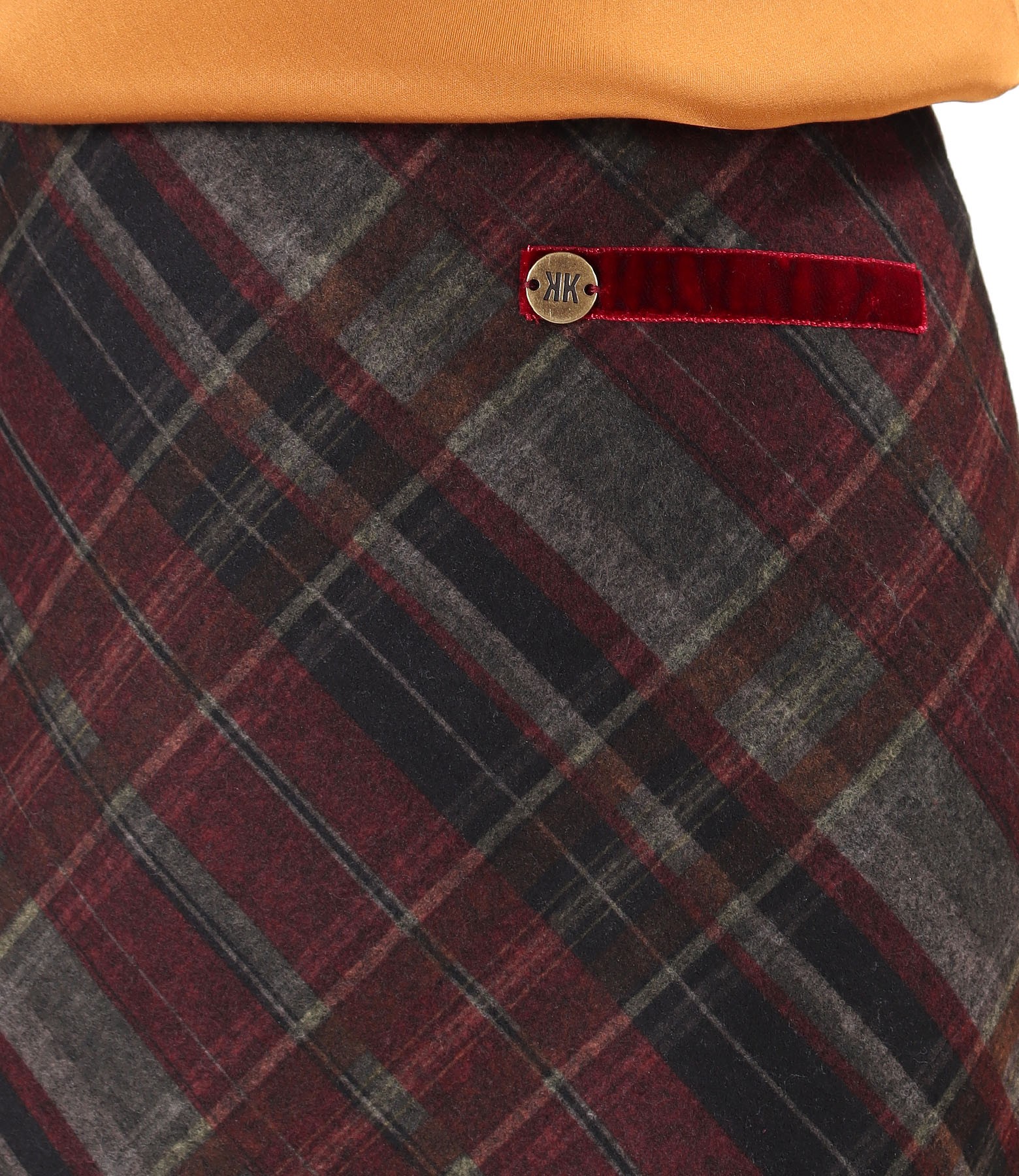 Fusta evazata din stofa elastica groasa cu viscoza in carouri si cu ornament din catifea in talie. Se inchide cu fermoar ascuns pe mijloc spate.