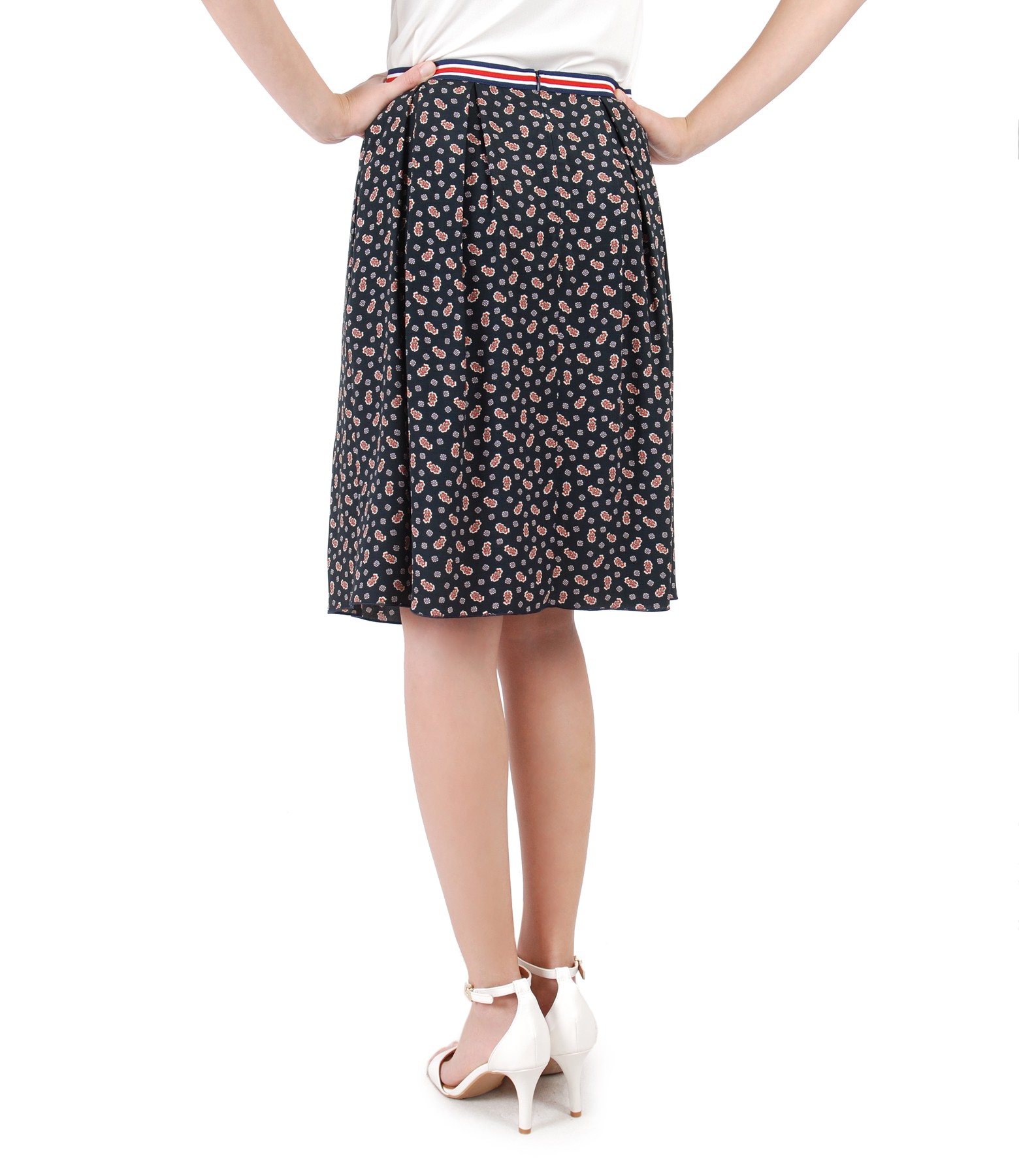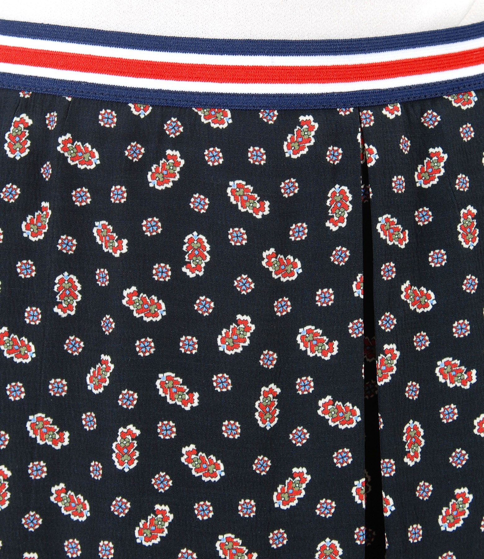 Fusta evazata din viscoza imprimata cu flori, cu pliuri fata si spate, buzunare laterale verticale si cordon elastic in talie. Se inchide cu fermoar ascuns pe mijloc spate.