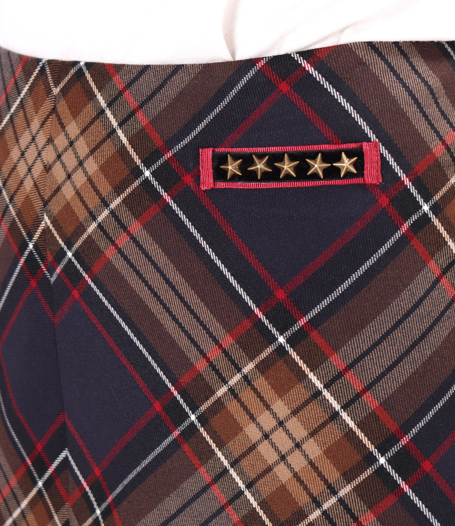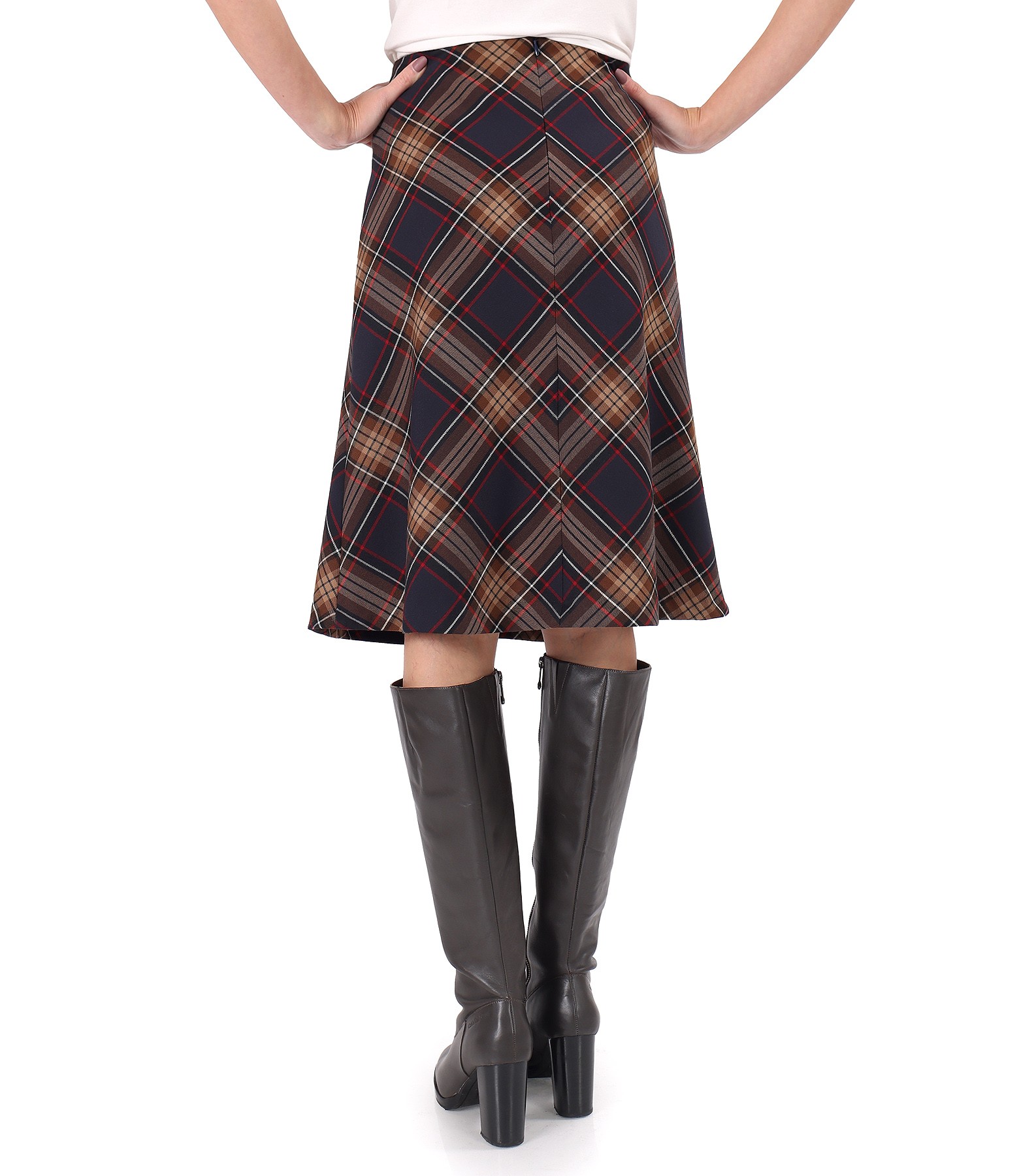 Fusta evazata din stofa elastica cu viscoza in carouri si cu ornament in talie. Se inchide cu fermoar ascuns pe mijloc spate.