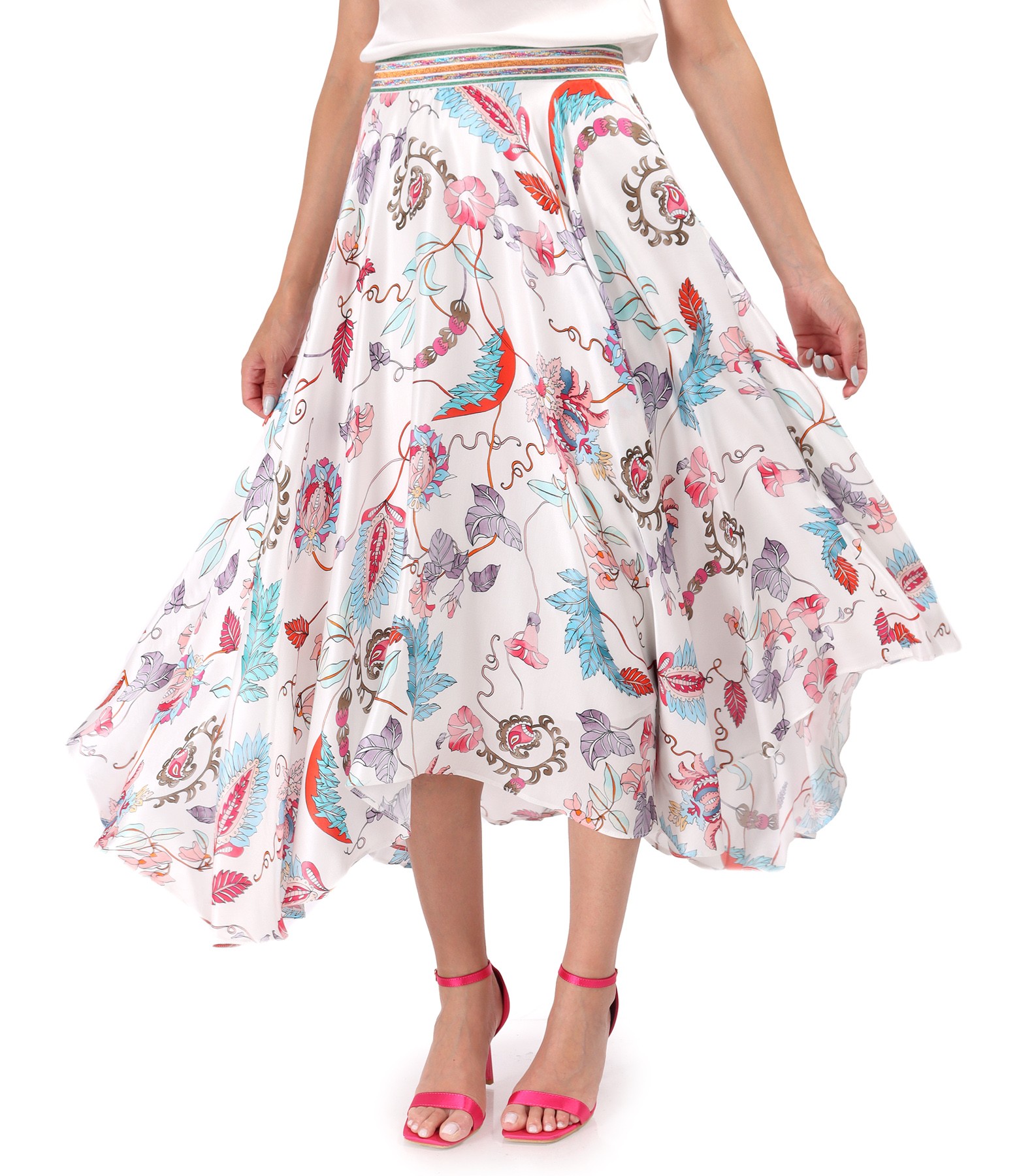Fusta lunga ampla din viscoza cu matase imprimata digital cu motive florale (Alb), marimea
