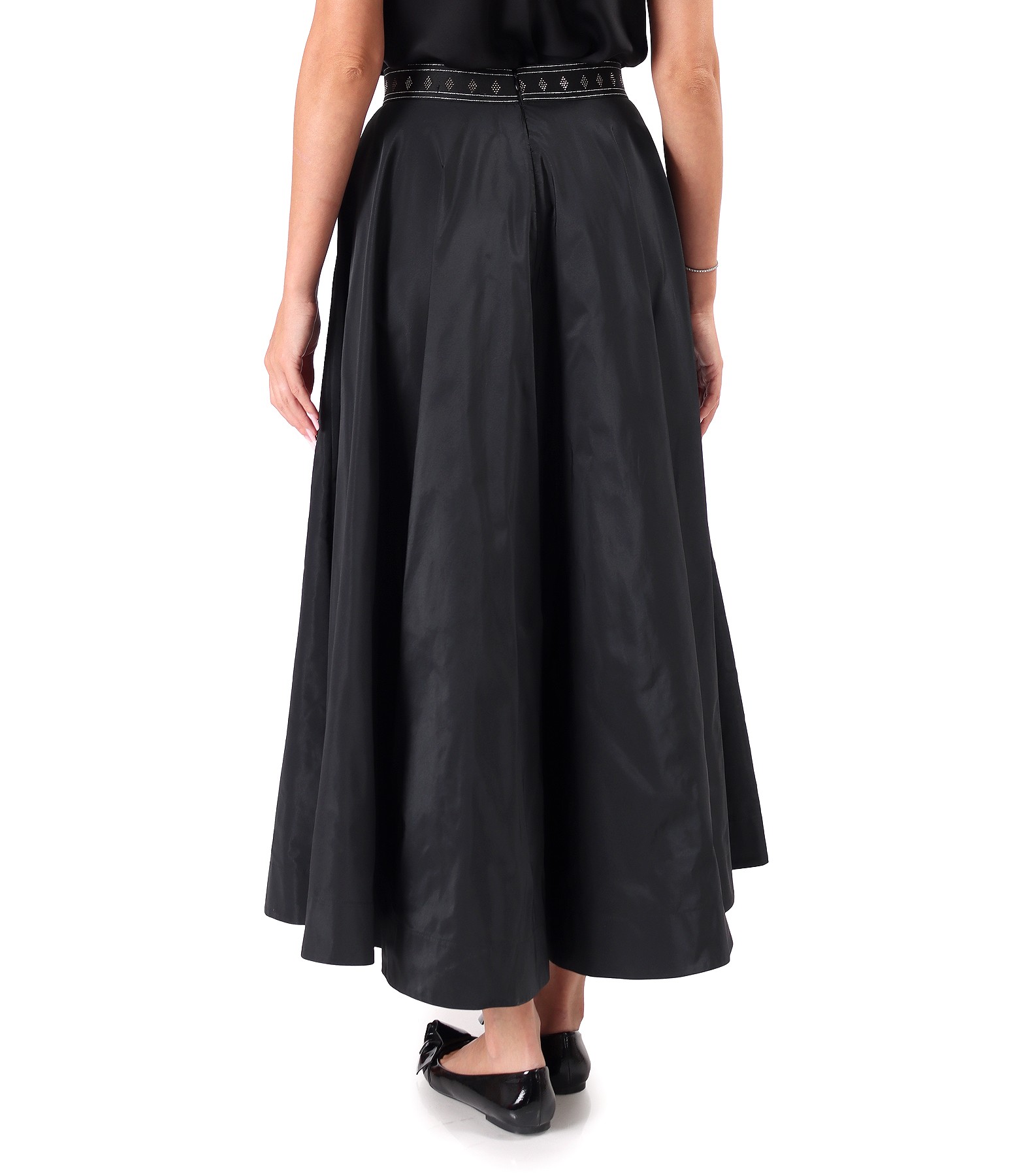 Fusta lunga clos din tafta usoara, cu efect mat, cu elastic decorativ cu cristale pe spate, si buzunare laterale. Se inchide cu fermoar ascuns pe mijloc spate.