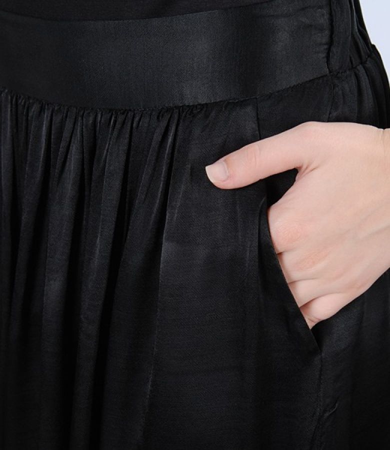Fusta lunga, lejera, din viscoza satinata, cu buzunare false laterale. Cordon drept pe fata, incretit si elasticizat pe spate, cu talia spate elasticizata.
