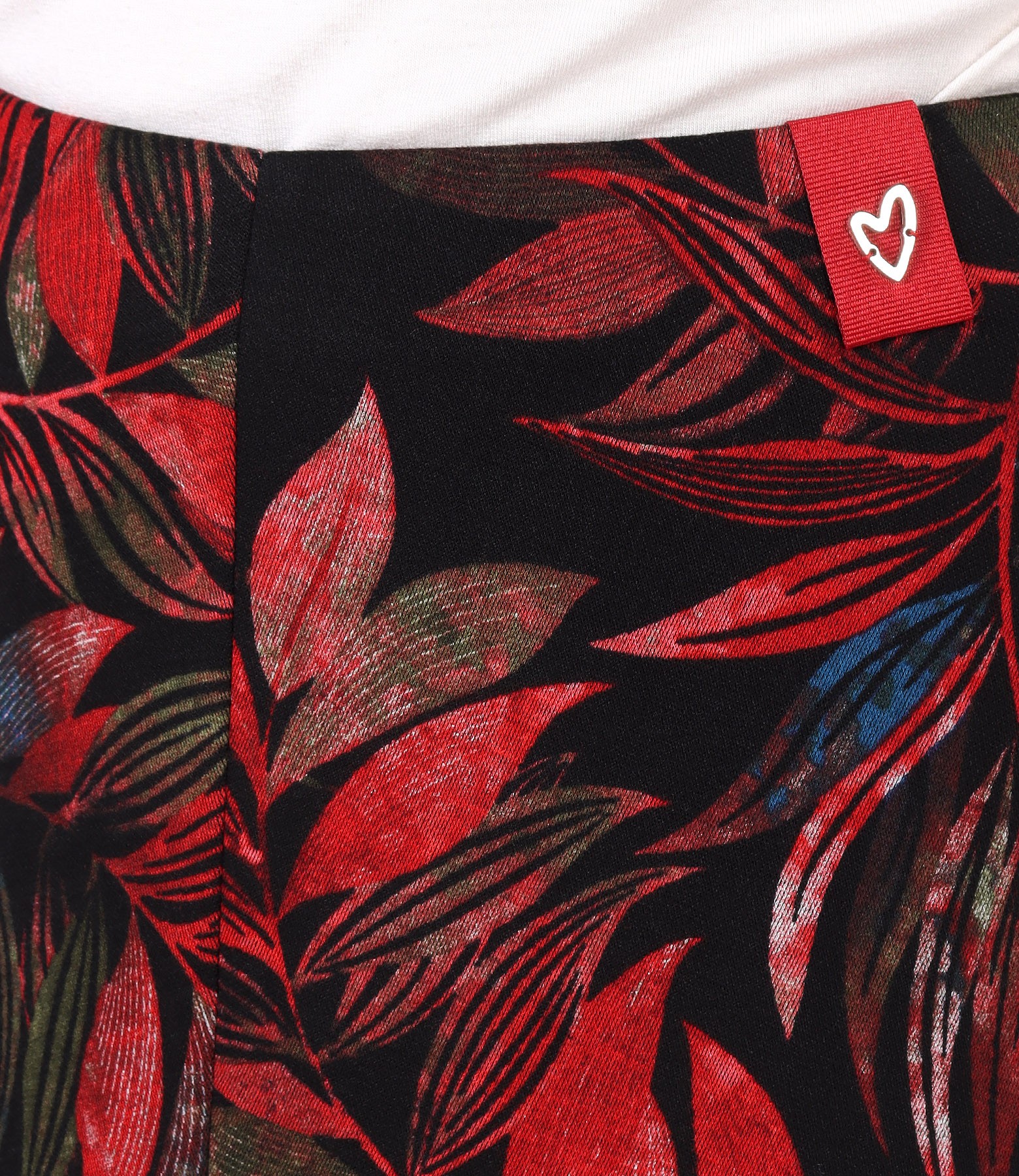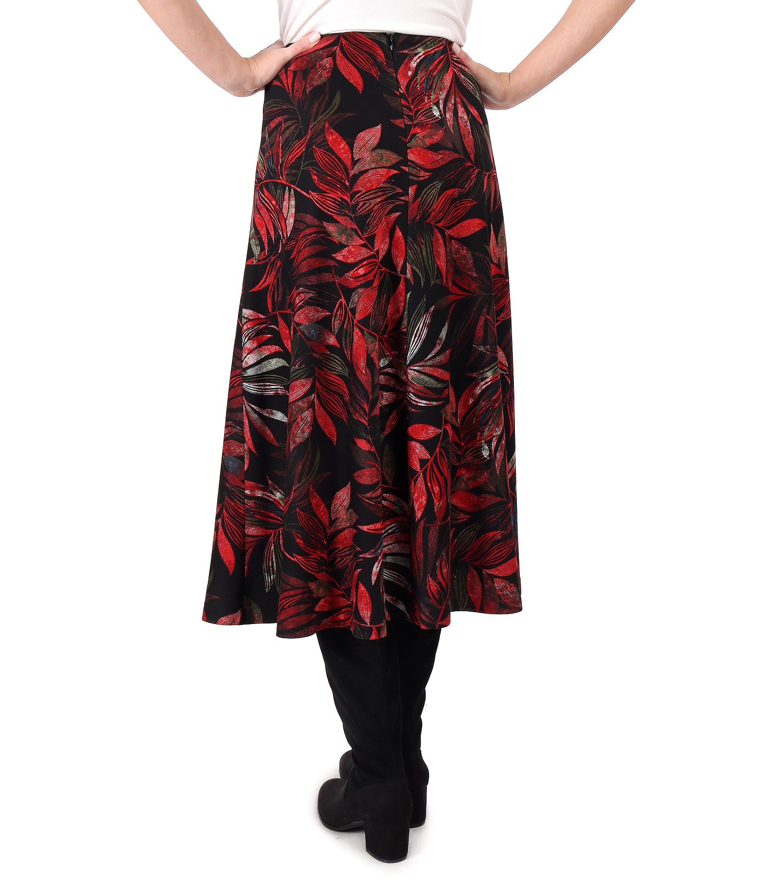 Fusta lunga evazata din jerse elastic gros imprimat cu motive florale, necaptusita si cu rips cu inima decorativa in talie. Se inchide cu fermoar ascuns pe mijloc spate.
