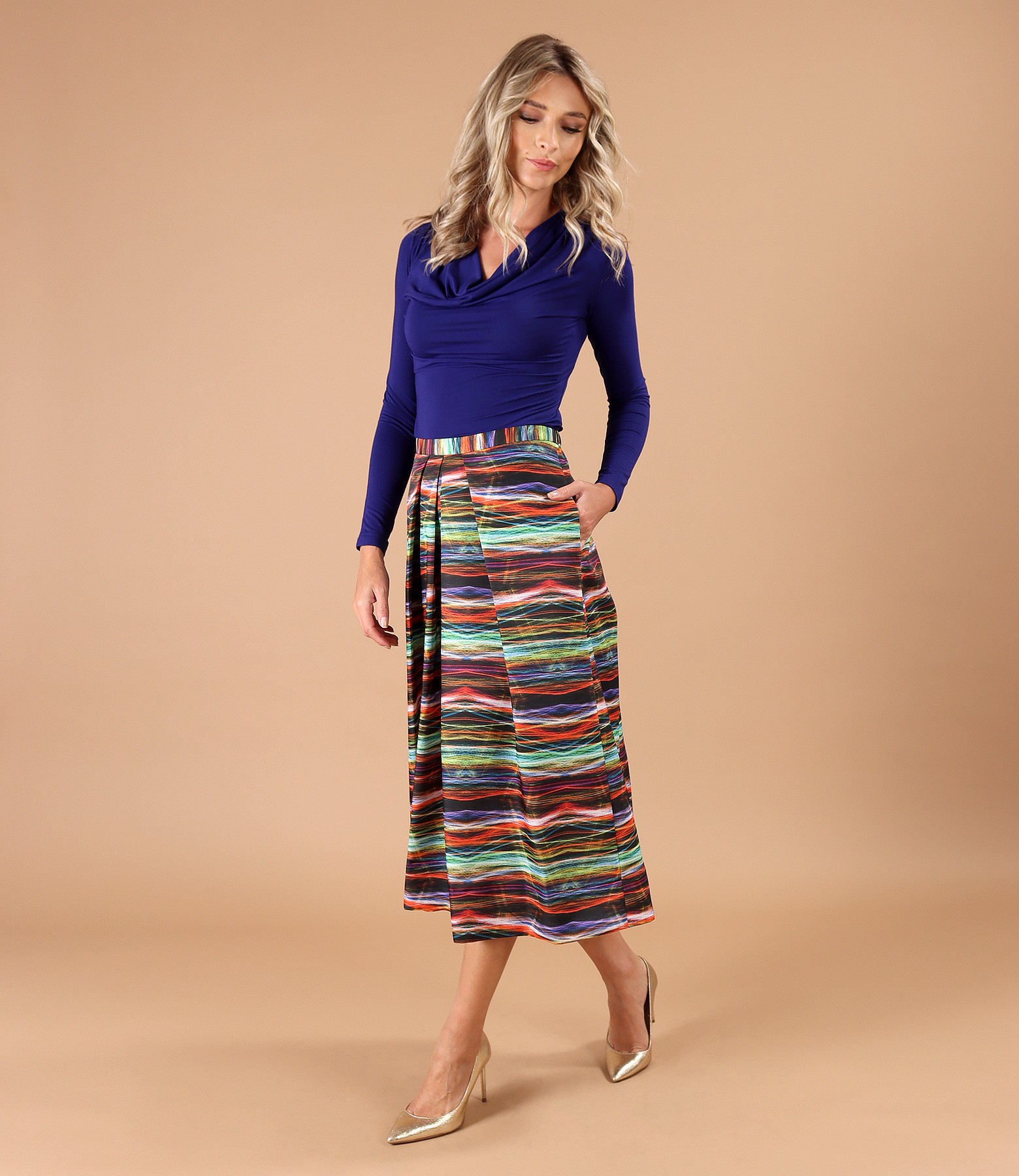 Fusta midi din stofa ripsata cu efect satinat, cu buzunare laterale, cu pliuri pe fata si pe spate si cu elastic in talie. Se inchide cu fermoar ascuns pe mijloc spate.