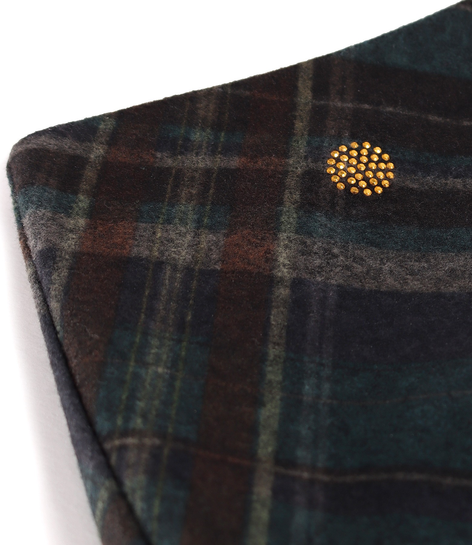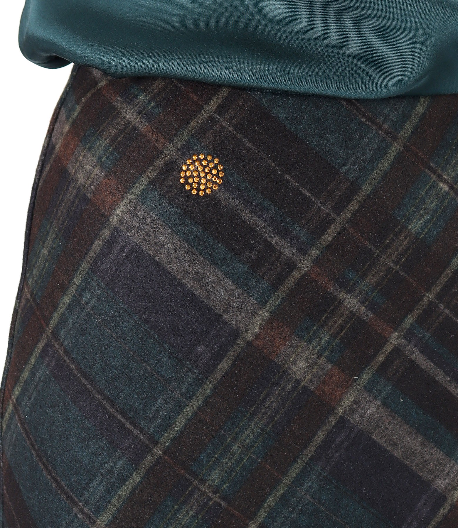 Fusta midi evazata din stofa elastica groasa in carouri, captusita si cu aplicatie decorativa in talie. Se inchide cu fermoar ascuns pe lateral stanga.