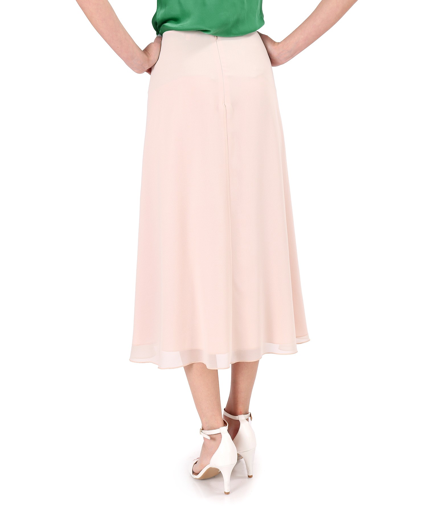 Fusta midi semiclos din voal uni, dublata cu viscoza. Se inchide cu fermoar ascuns pe mijloc spate.