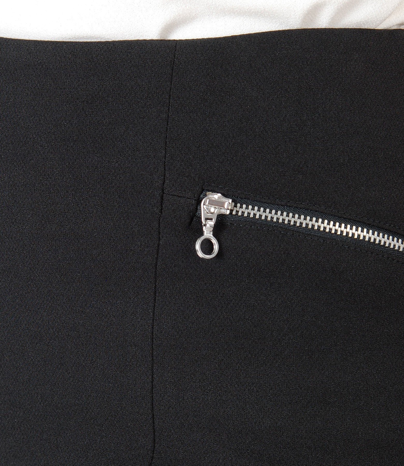 Fusta office din stofa elastica, captusita, fermoare decorative, fara cordon in talie si cu slit petrecut la spate. Se inchide cu fermoar ascuns pe mijloc spate.