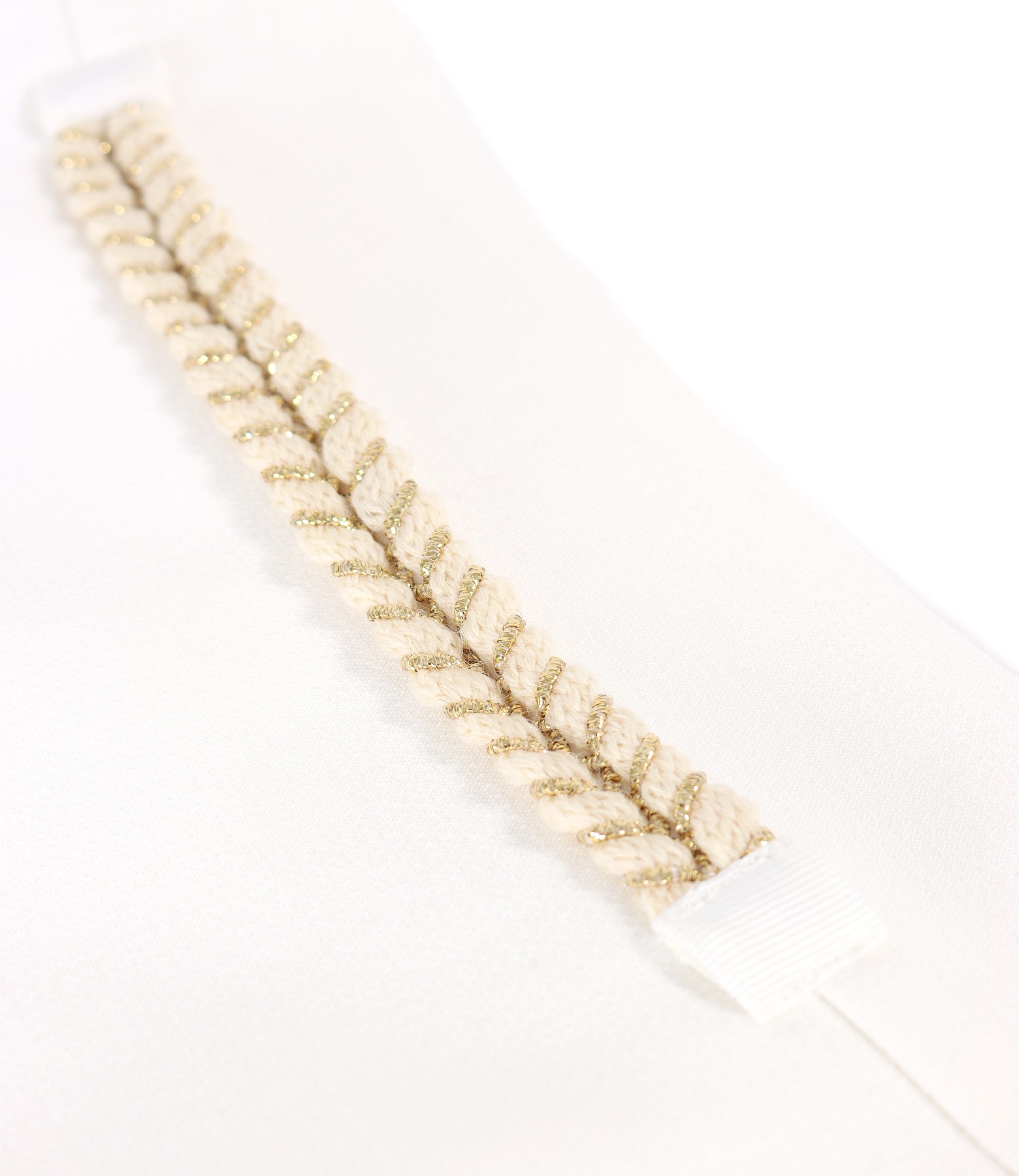 Fusta office din stofa elastica, usor conica, captusita si cu cordon lat in talie si pasmanterie aurie. Se inchide cu fermoar ascuns pe mijloc spate.