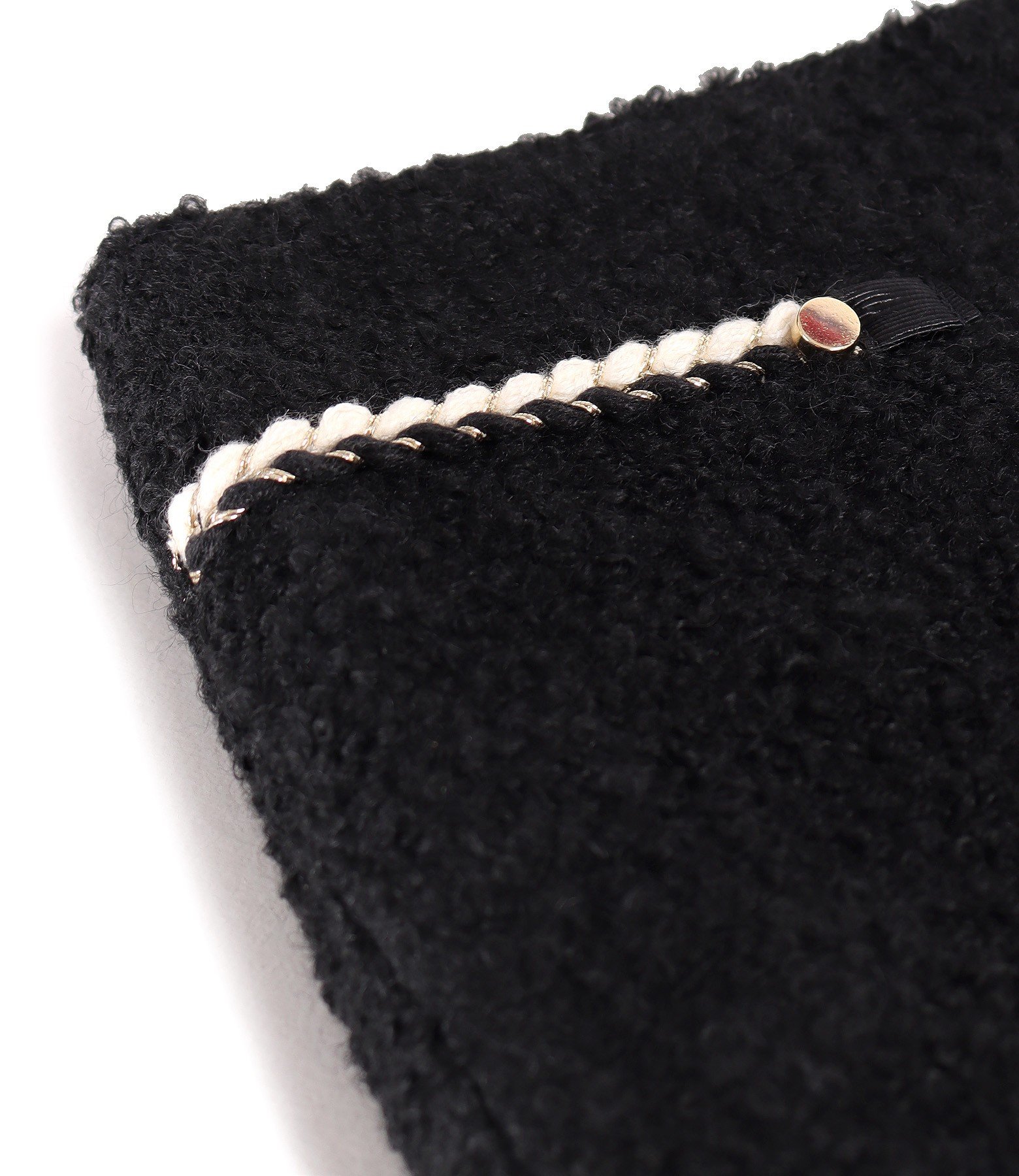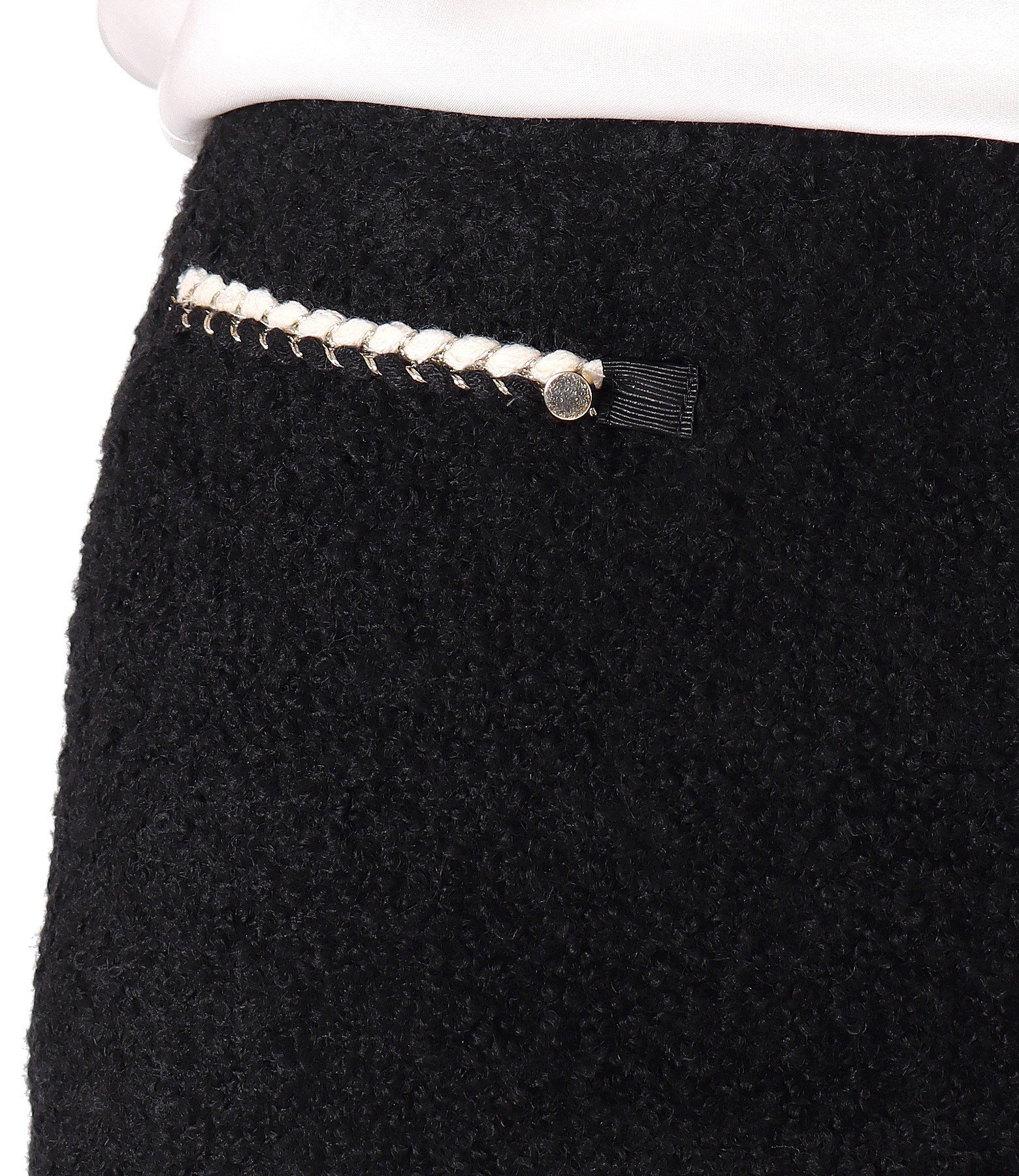 Fusta office din bucle cu lana, captusita, cu pasmanterie fata si cu slit petrecut pe mijloc spate. Se inchide cu fermoar ascuns pe mijloc spate.