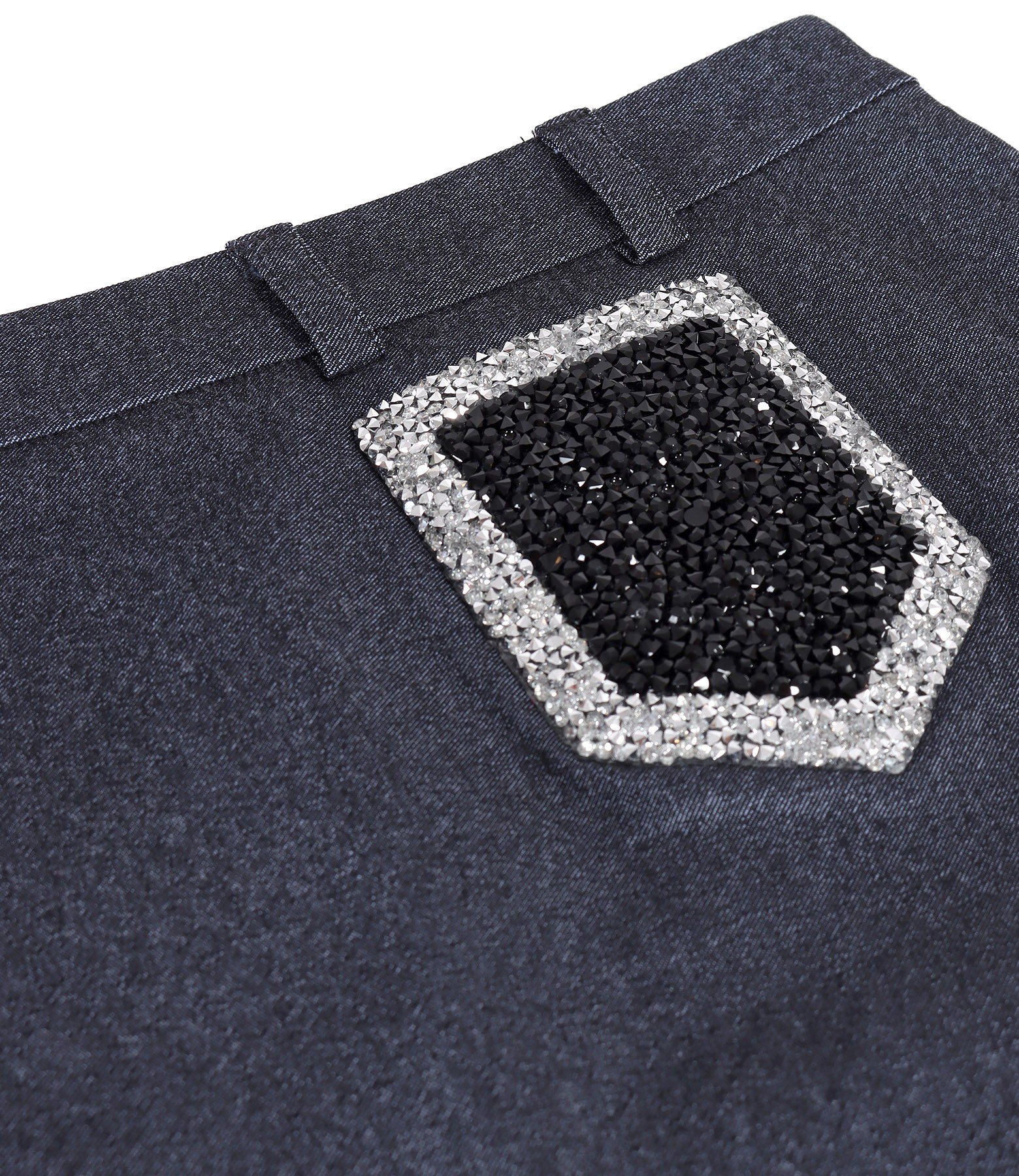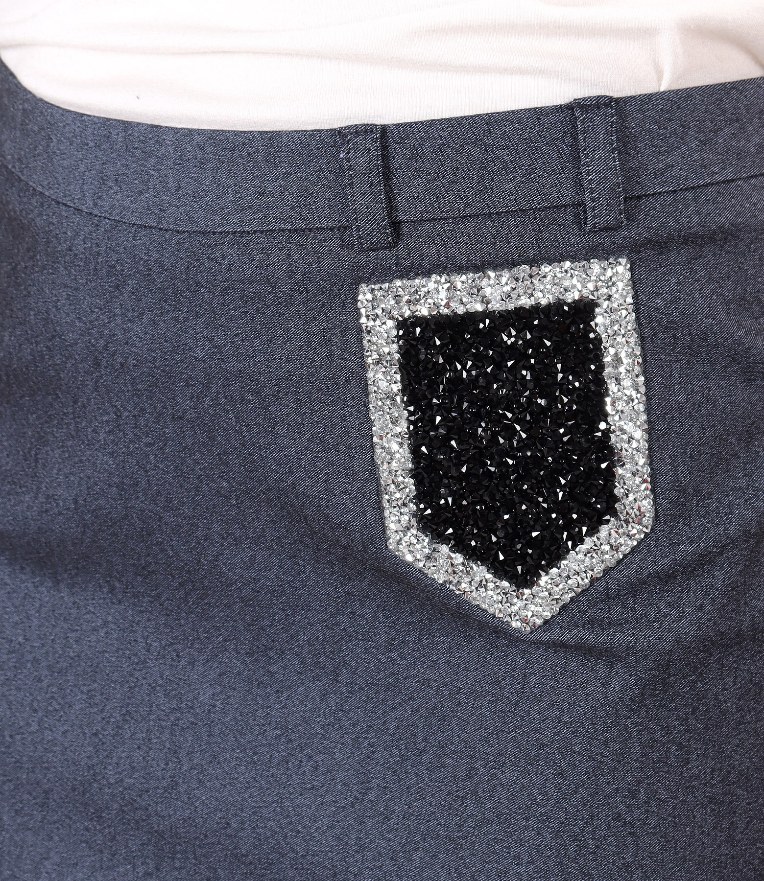 Fusta office din denim elastic, necaptusita, cu cordon in talie, buzunar decorativ si cu slit petrecut la spate. Se inchide cu fermoar ascuns pe mijloc spate.