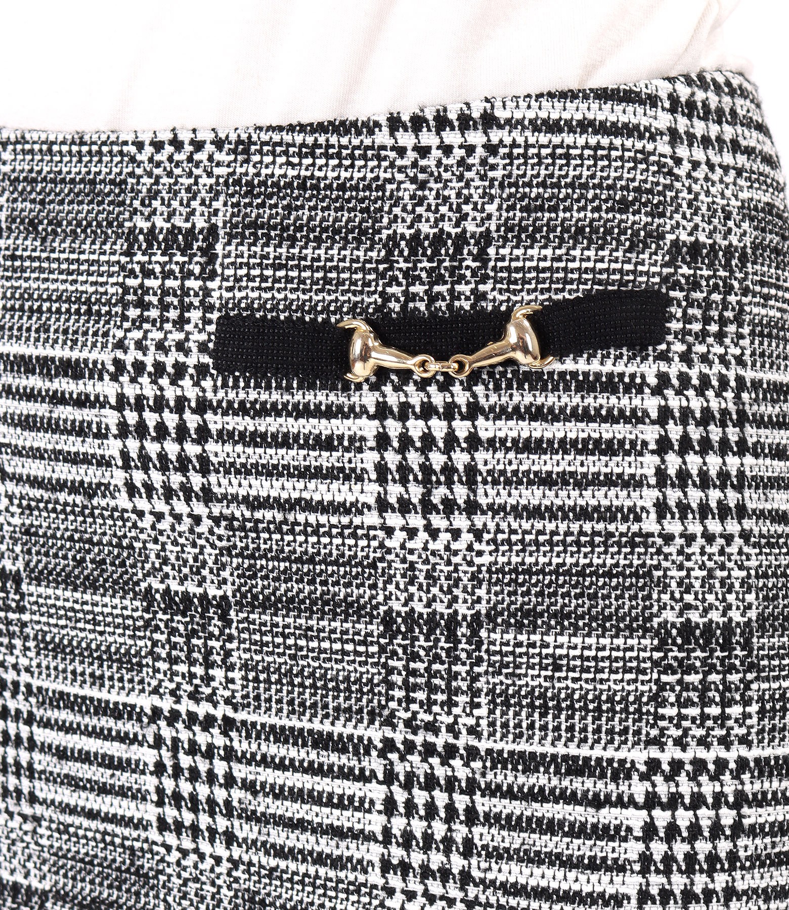 Fusta office din stofa texturata in carouri cu element decorativ pe fata si cu slit petrecut pe mijloc spate. Se inchide cu fermoar ascuns pe mijloc spate.
