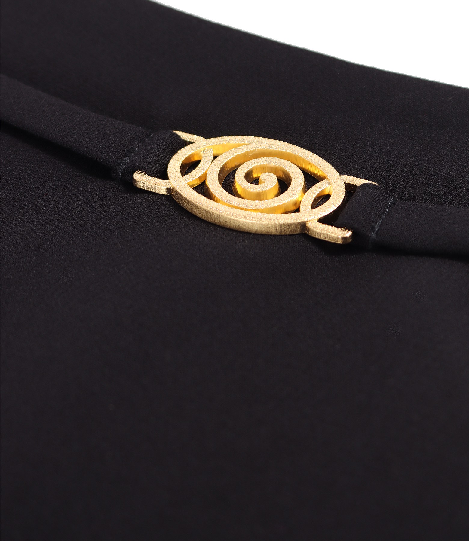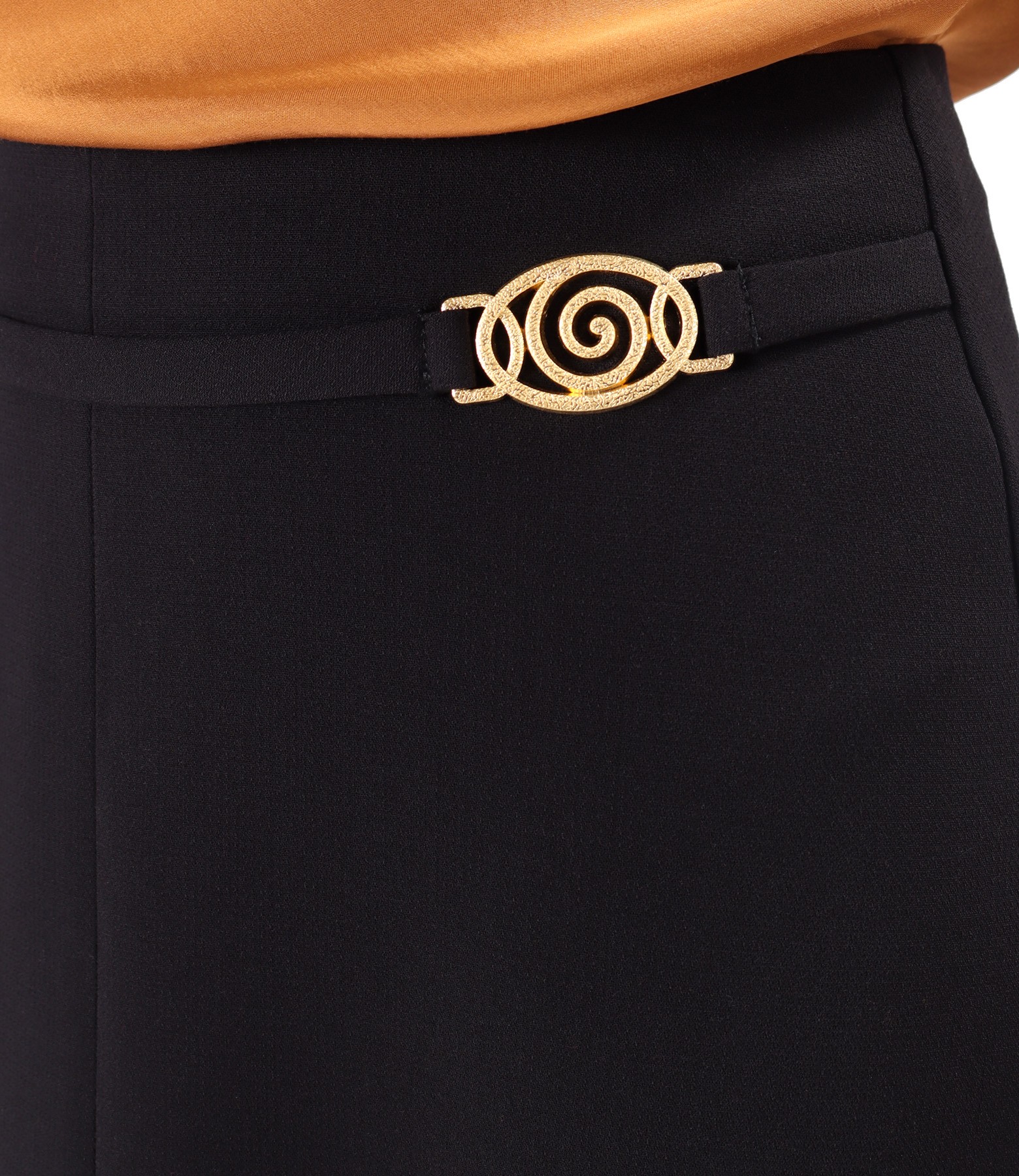 Fusta scurta evazata din stofa elastica cu viscoza, cu catarama aurie in talie. Se inchide cu fermoar ascuns pe mijloc spate.