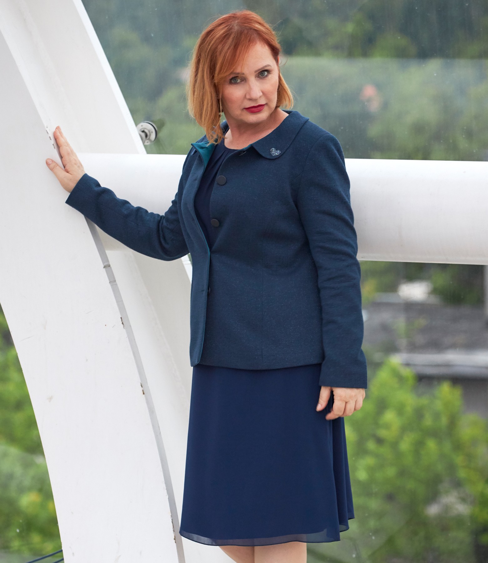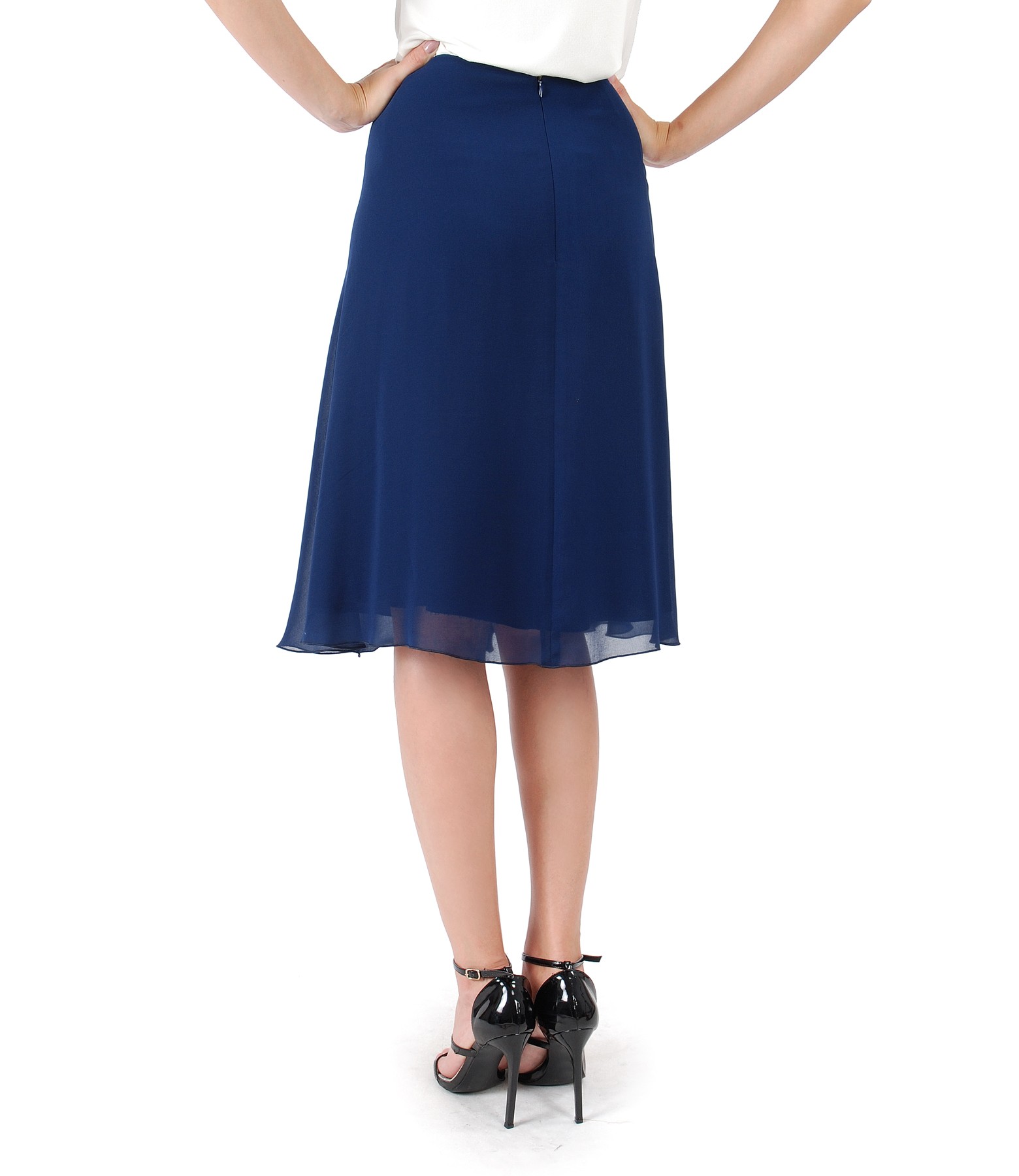 Fusta semiclos din voal uni, dublata cu viscoza. Se inchide cu fermoar ascuns pe mijloc spate.