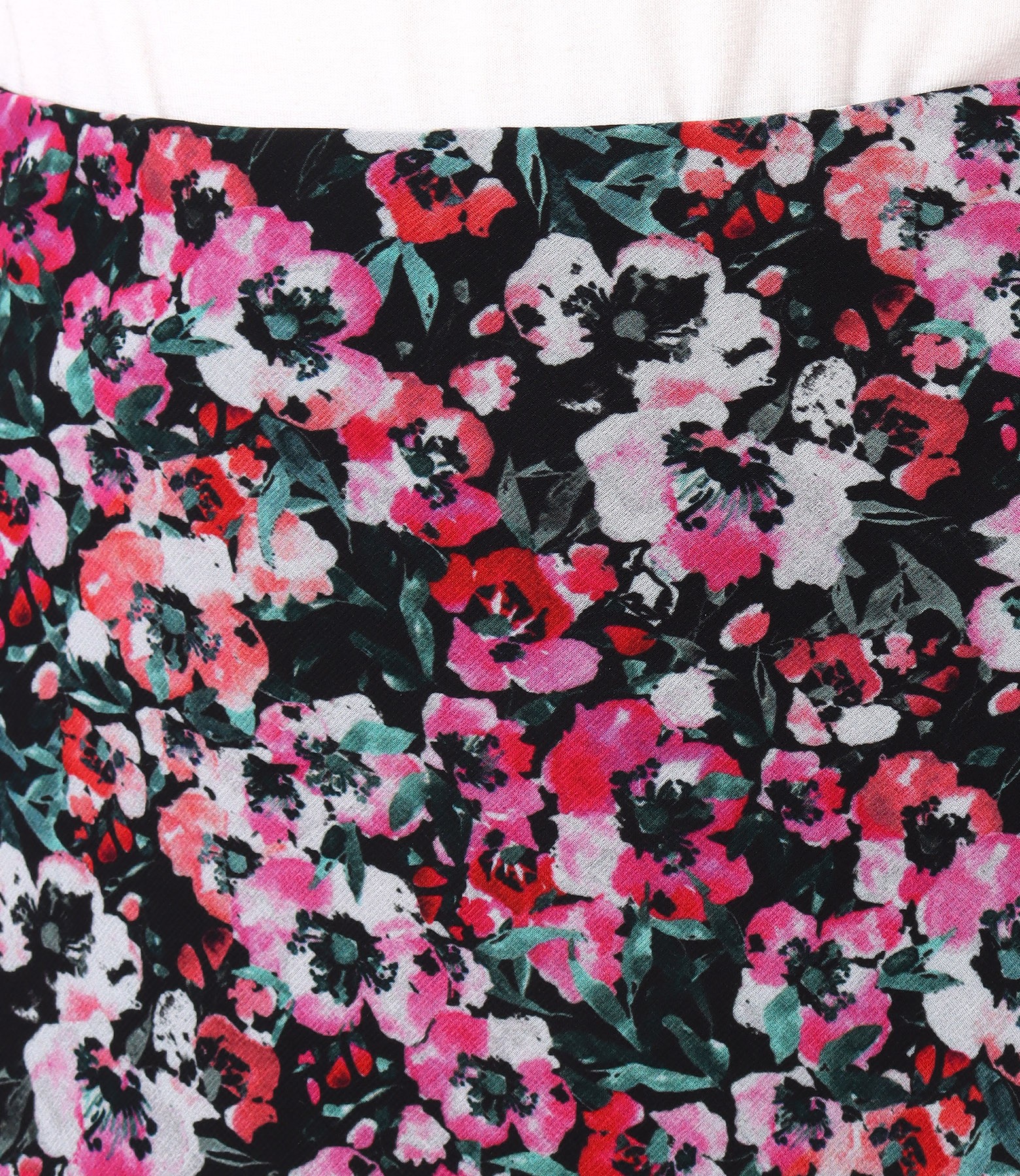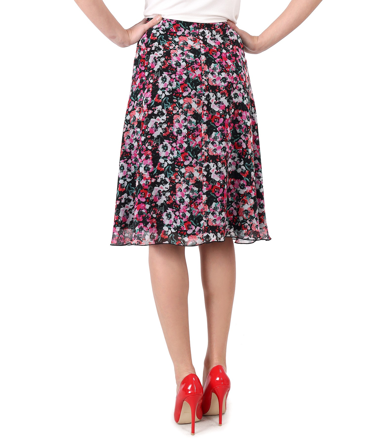 Fusta semiclos din voal imprimat cu motive florale, dublata cu viscoza. Se inchide cu fermoar ascuns pe mijloc spate.