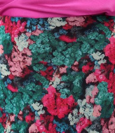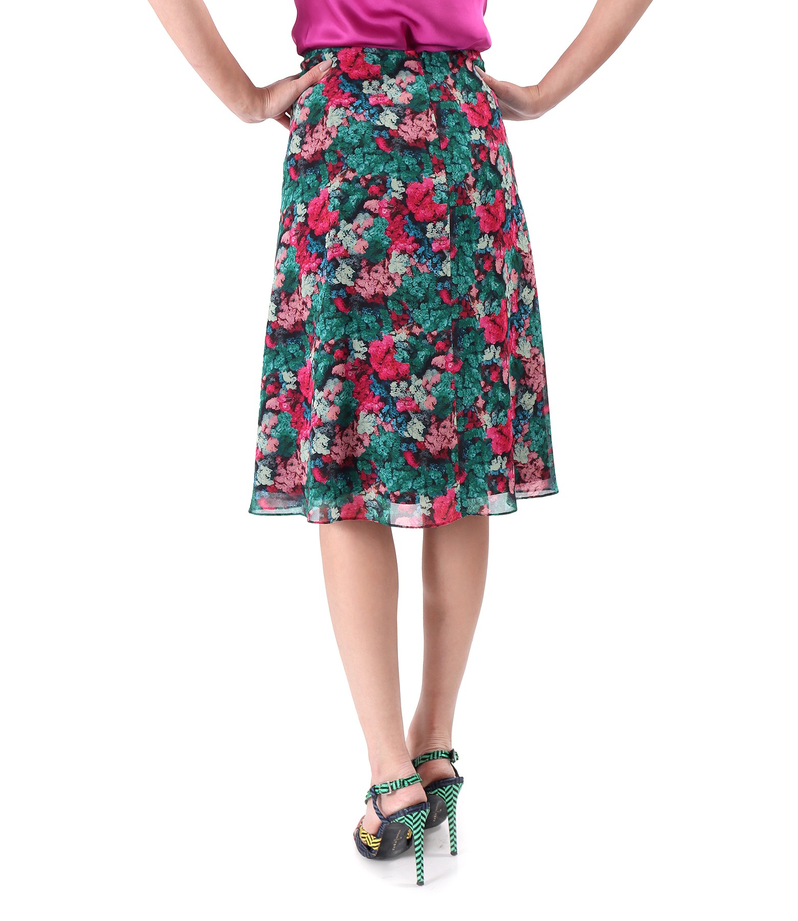Fusta semiclos din voal imprimat cu motive florale, dublata cu viscoza. Se inchide cu fermoar ascuns pe mijloc spate.
