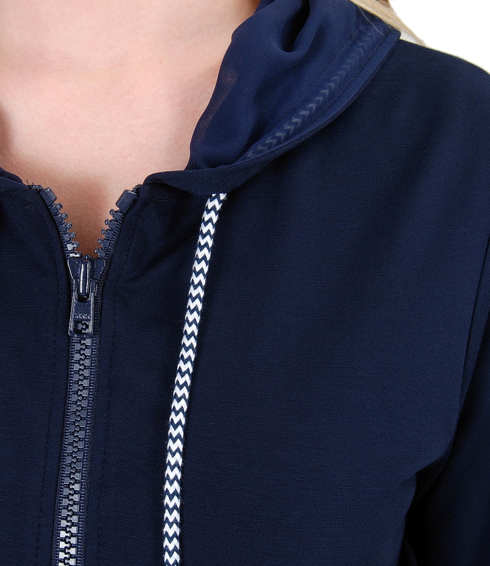 Hanorac din jerse elastic uni, cu gluga cu sireturi captusita cu voal, aplicatii pe maneci, garnitura elastica in dungi la terminatii si buzunare laterale ascunse. Se inchide cu fermoar pe mijloc fata.