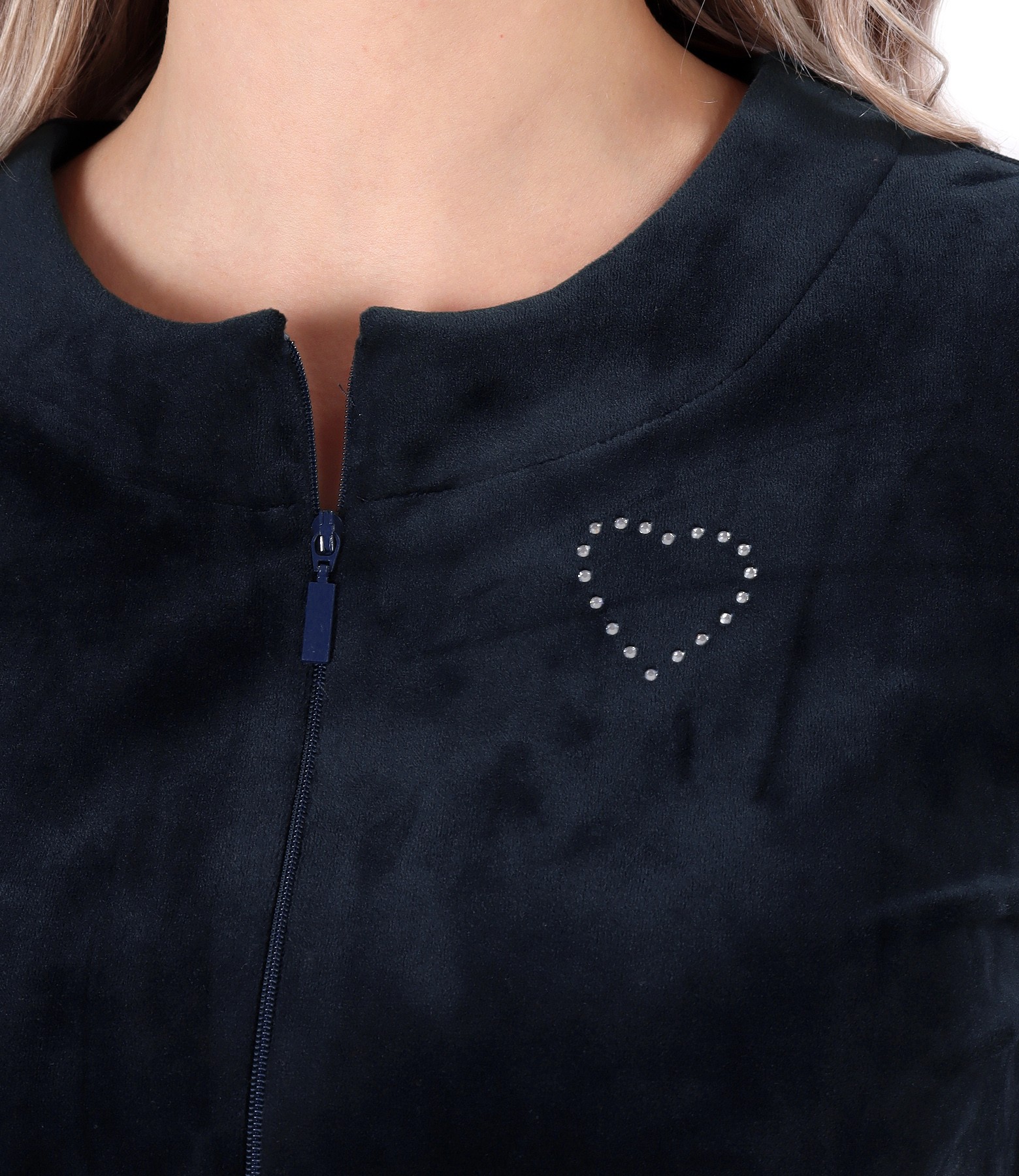 Hanorac fara gluga, din catifea elastica uni, necaptusit, cu maneci lungi, cu terminatie elastica cu cristale si cu inima decorativa la decolteu. Se inchide cu fermoar pe mijloc fata.