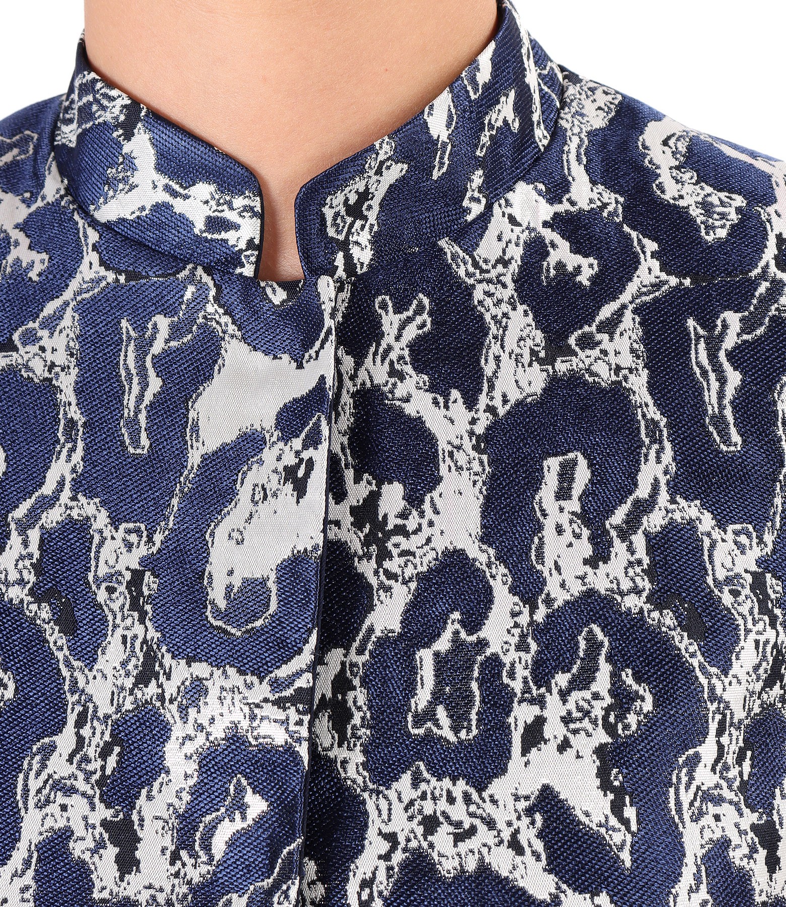 Jacheta eleganta din brocart cu fir metalic si tesut cu motive geometrice, captusita, cu guler gen tunica, cu decolteu pe langa gat si cu doua buzunare laterale. Se inchide pe fata cu 5 capse pana la baza gatului.