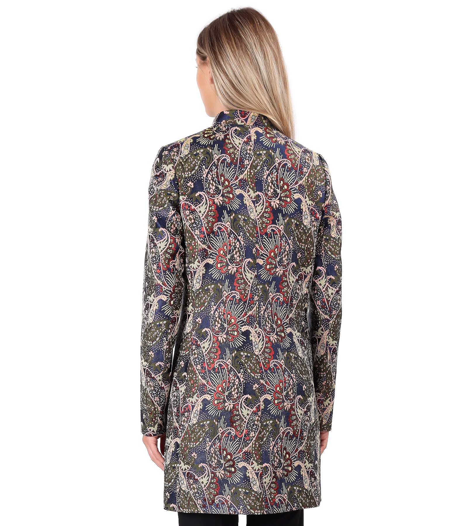 Jacheta eleganta din brocart cu fir metalic si tesut cu motive paisley, captusita, cu guler gen tunica, cu decolteu pe langa gat si cu doua buzunare laterale. Se inchide pe fata cu 5 capse pana la baza gatului.