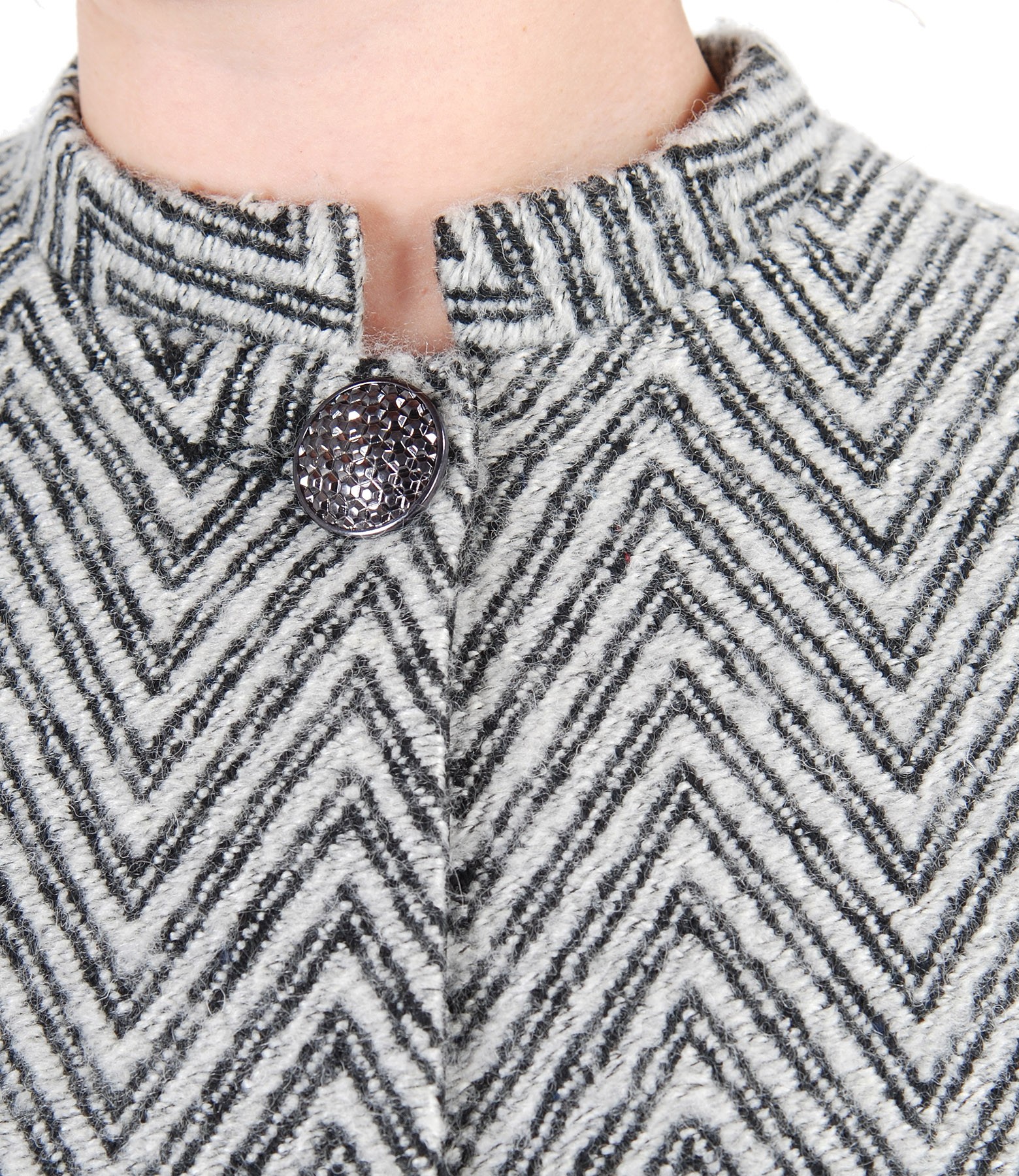 Jacheta eleganta, captusita, fara guler, cu decolteu pe langa gat si cu doua buzunare laterale cu fermoar. Se inchide pe fata cu 4 nasturi pana la baza gatului.