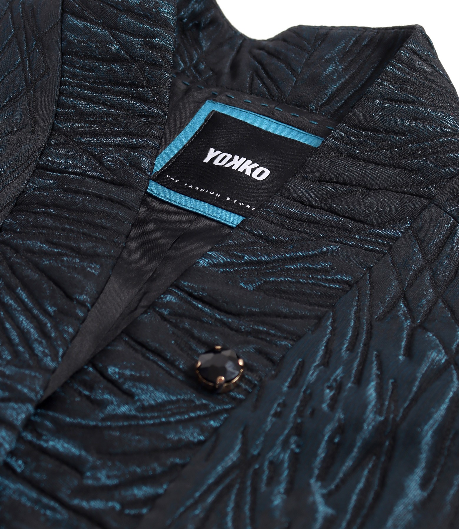 Jacheta oversize din brocart versatil cu maneci 3/4, cu buzunare laterale si cristal aplicat la decolteu. Nu are sistem de inchidere.