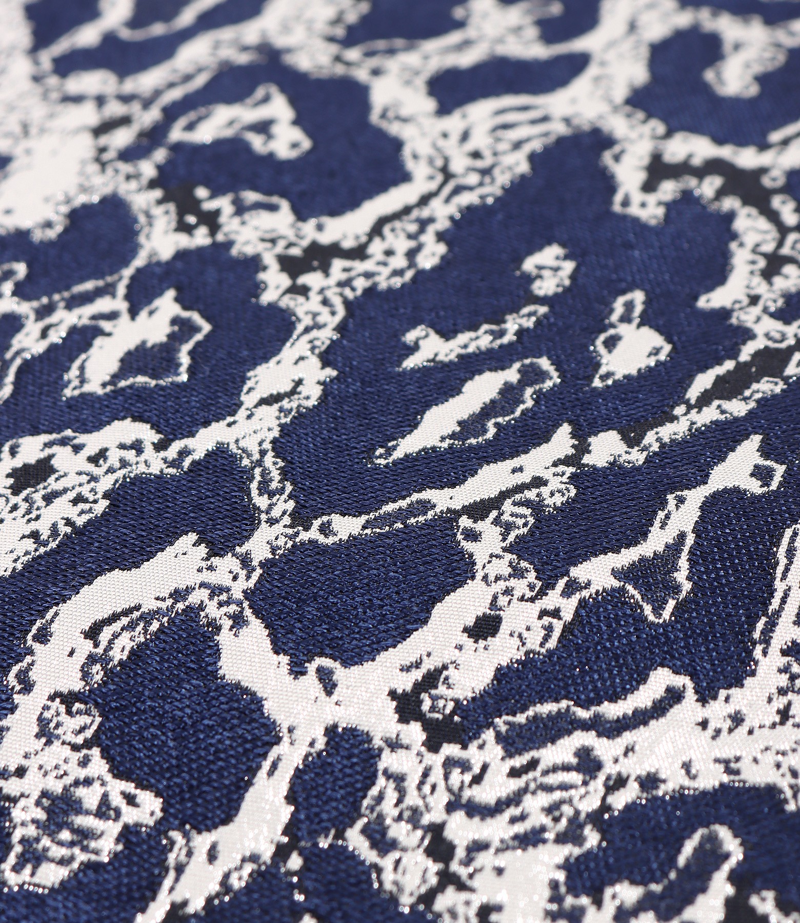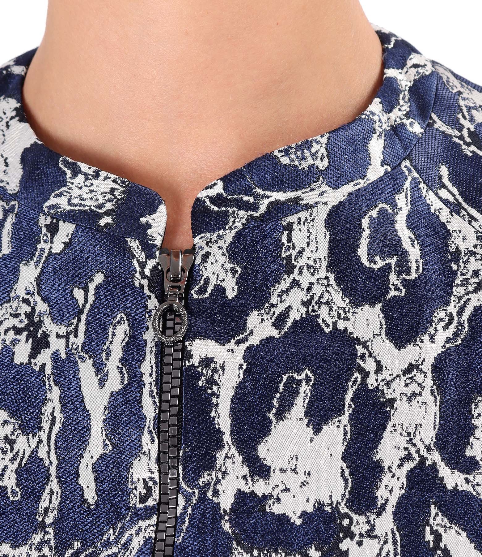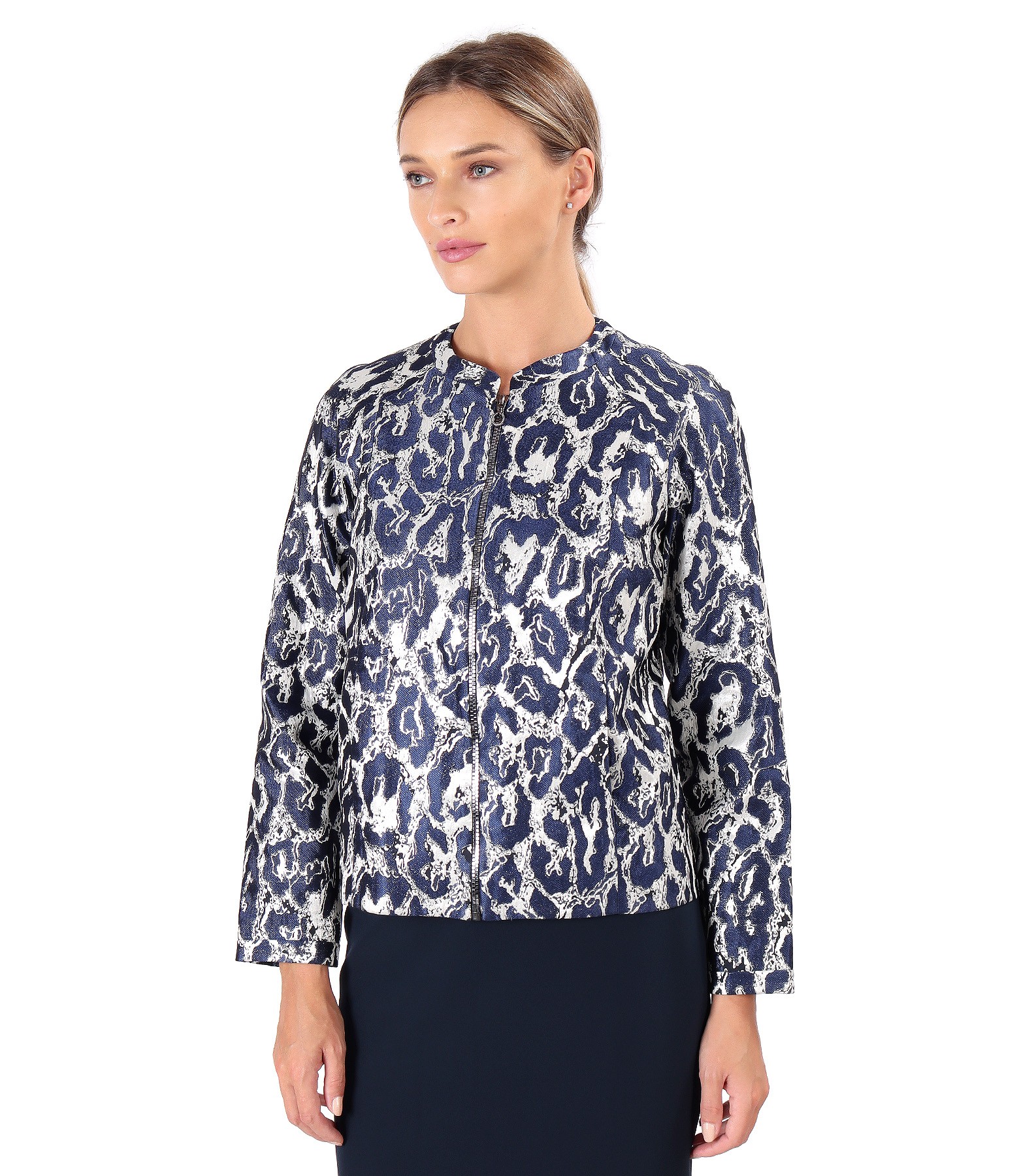 Jacheta scurta din brocart cu fir metalic si tesut cu motive geometrice, captusit, cu maneci raglan si buzunare laterale verticale. Se inchide cu fermoar pe mijloc fata.