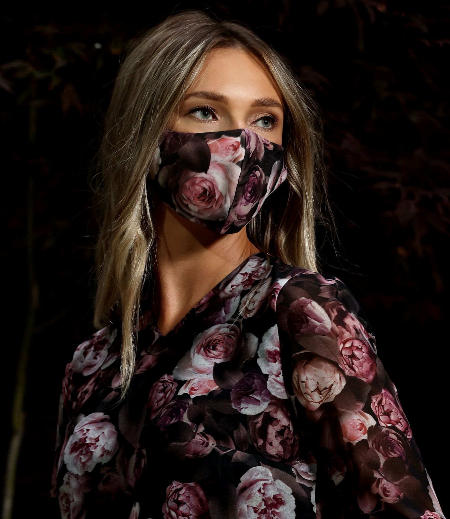 Masca refolosibila din voal imprimat cu motive florale. Este captusita cu viscoza si are prindere pe laterale cu elastice.