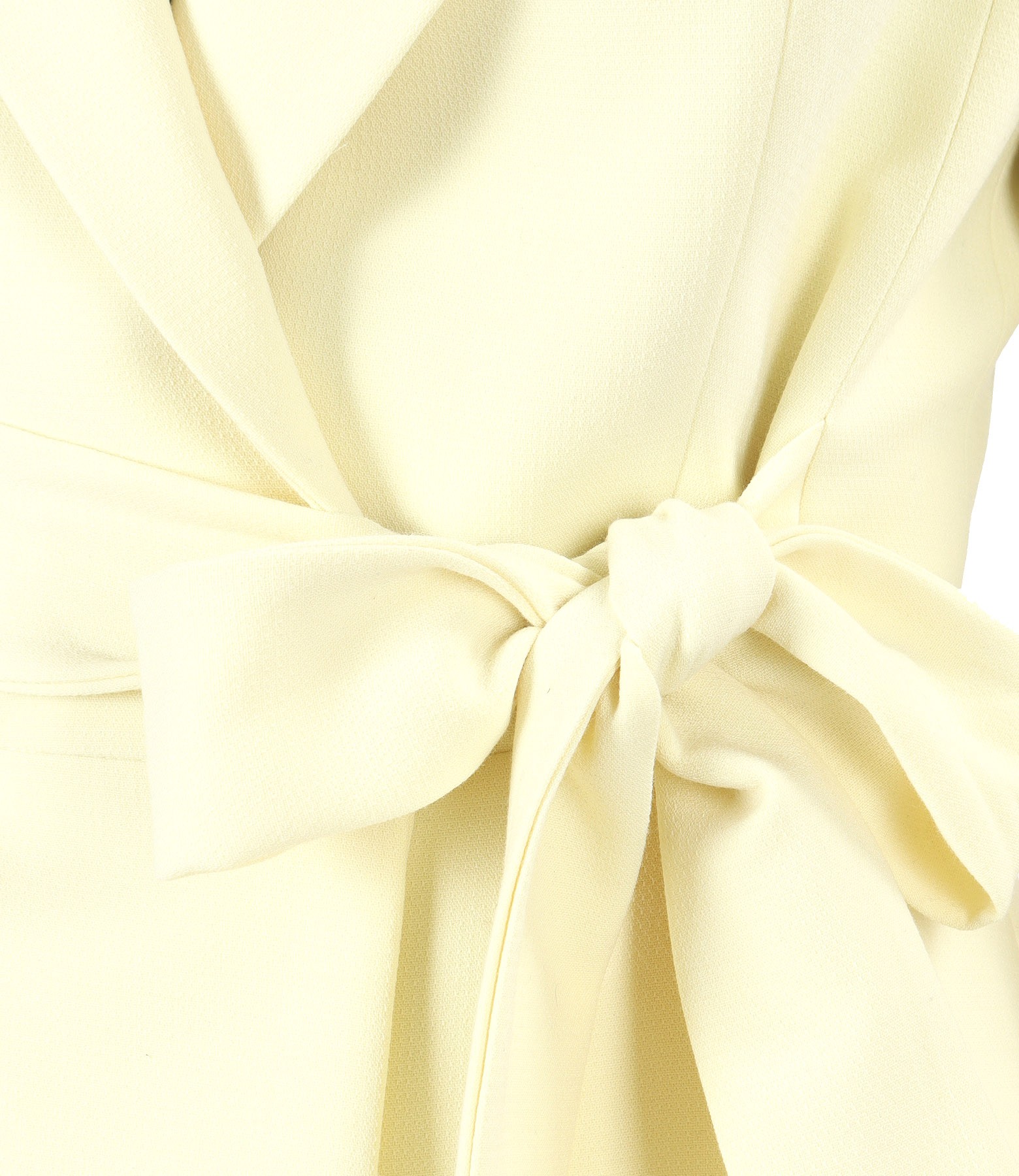 Sacou office din stofa elastica cu cordon in talie, fara guler, cu revere late cu pin decorativ si slit scurt pe mijloc spate. Se inchide cu 2 capse mos-baba si cordon pe fata.
