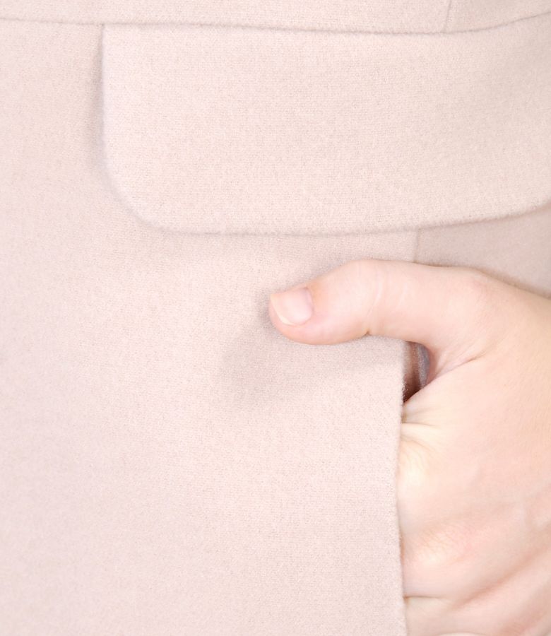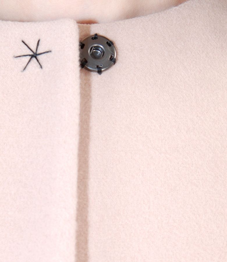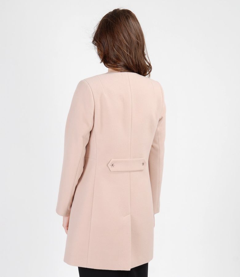 Palton din stofa elastica cu linie lejera, fara guler, cu decolteu pe langa gat. Doua buzunare laterale ascunse si doua clape in talie. Se inchide cu 5 capse mos-baba, pana la baza gatului.
