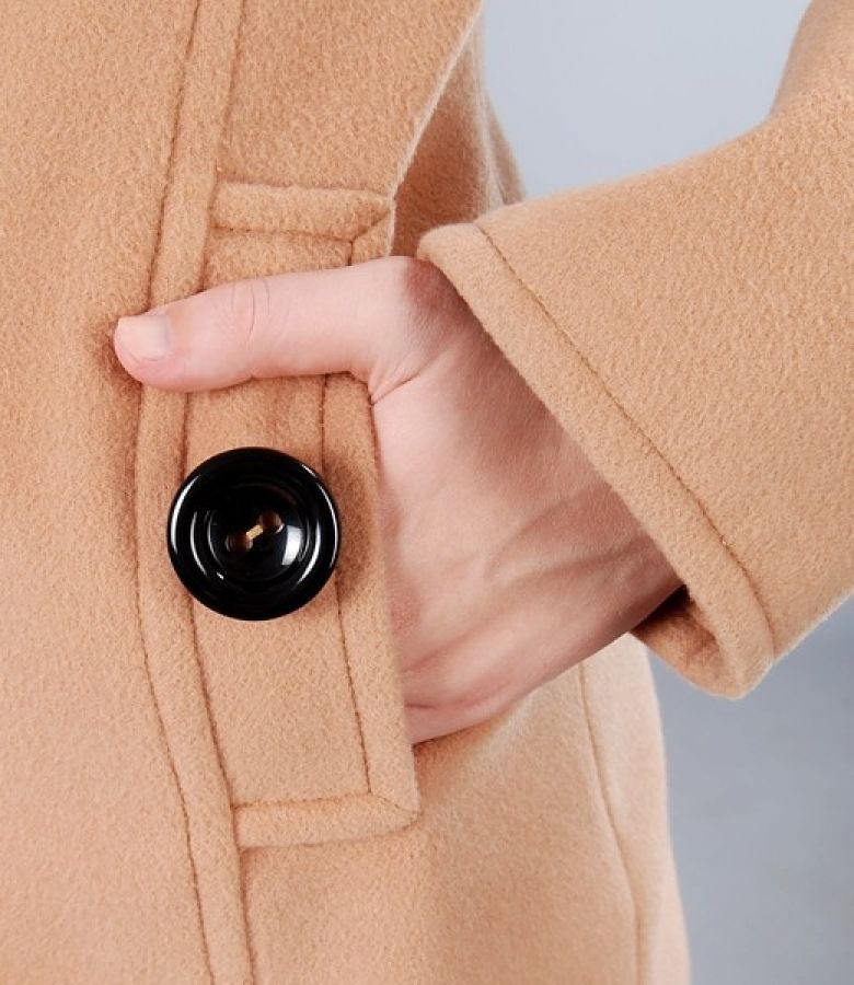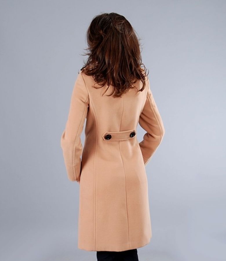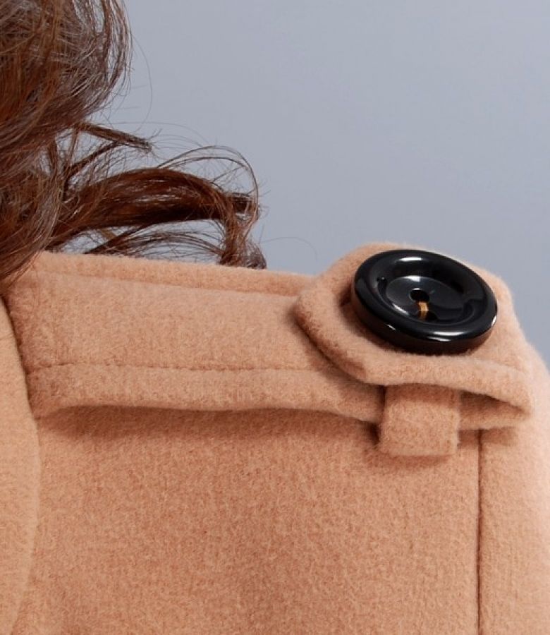 Palton cu guler pe gat si buzunare cu clape verticale si nasture decorativ. Maneci lungi cu mansete late, cordon cu nasturi fixat pe spate. Epoleti pe umeri cu gaici, fixati cu cate un nasture. Se inchide cu 6 nasturi contrast pe fata.