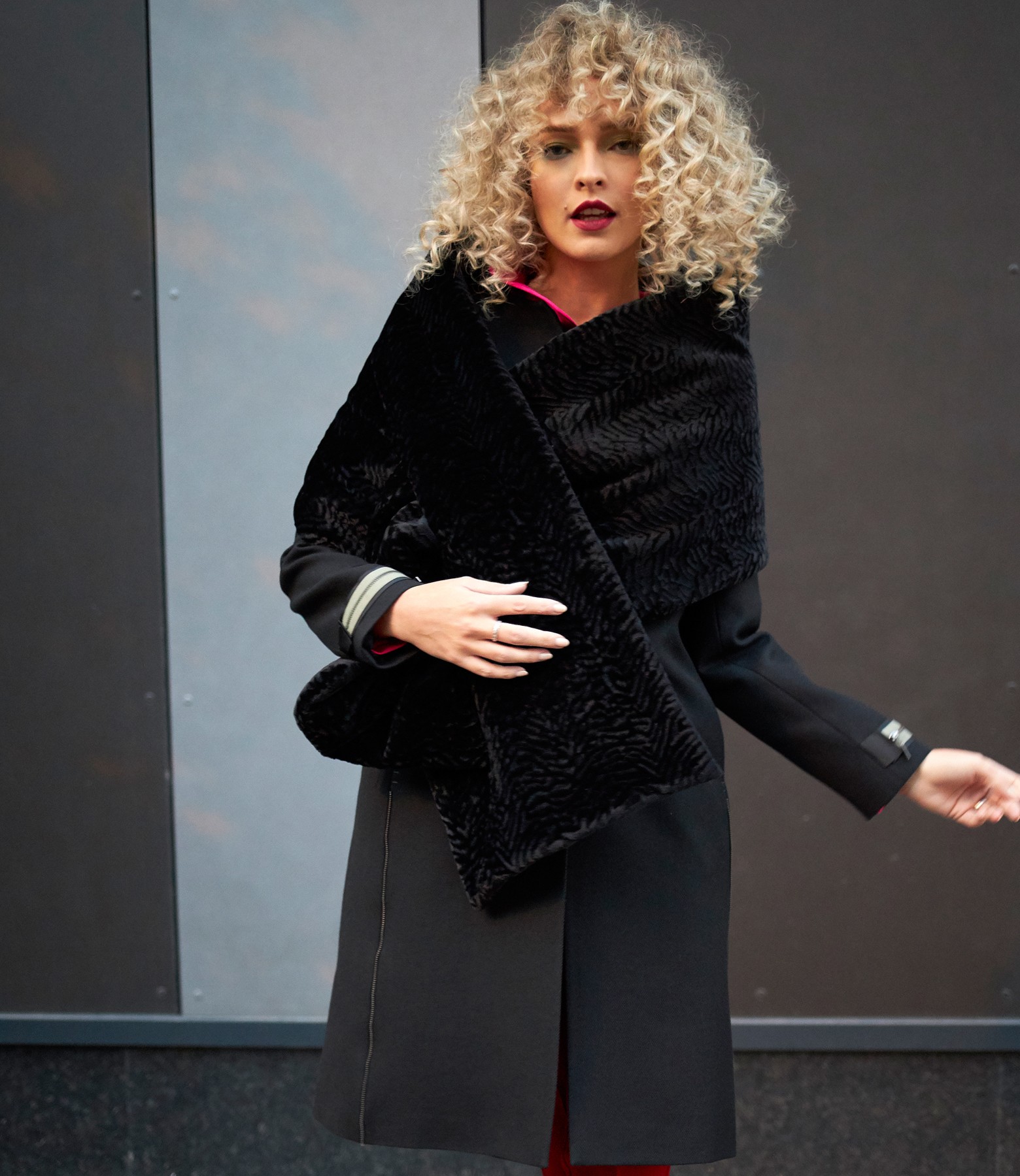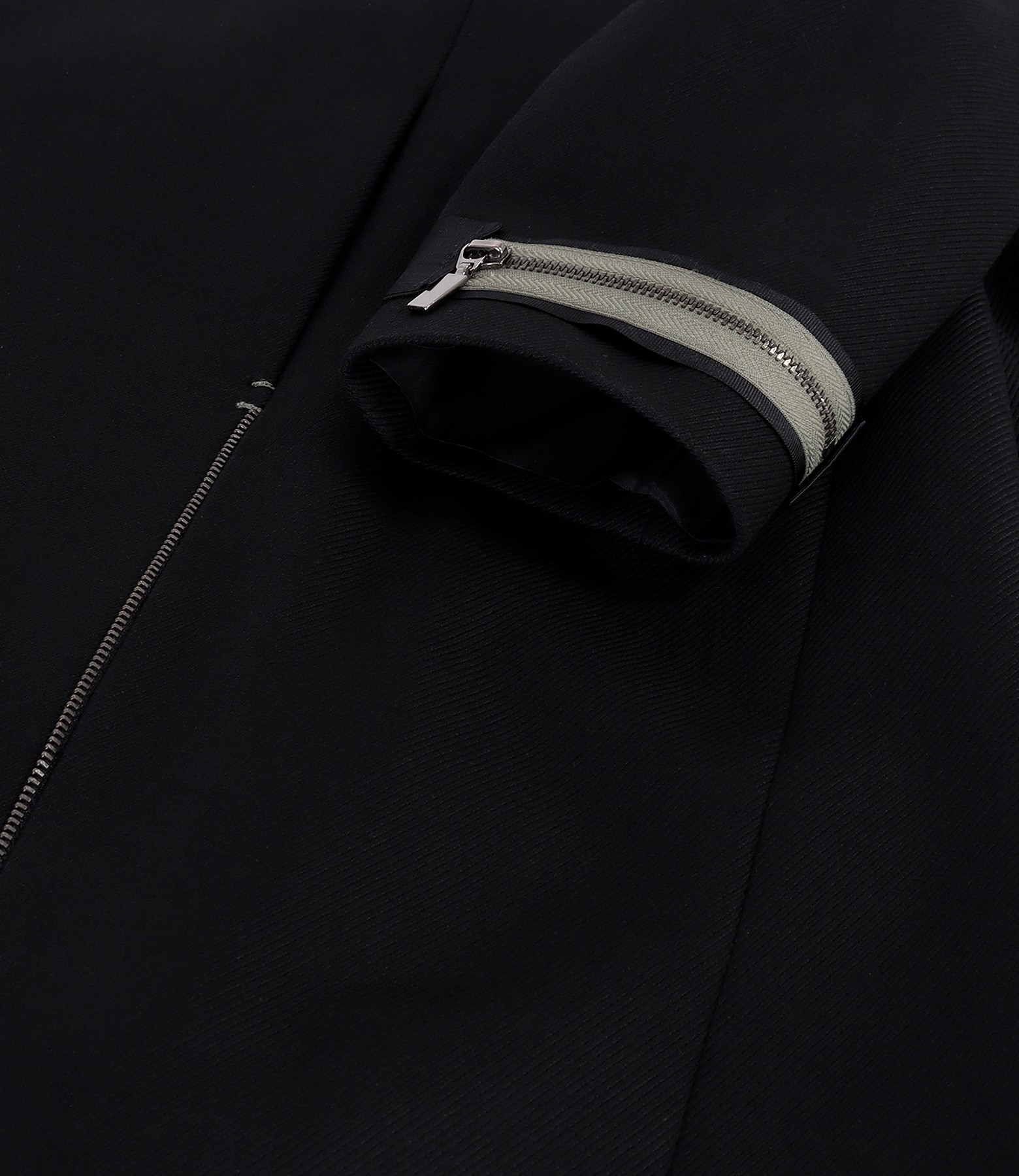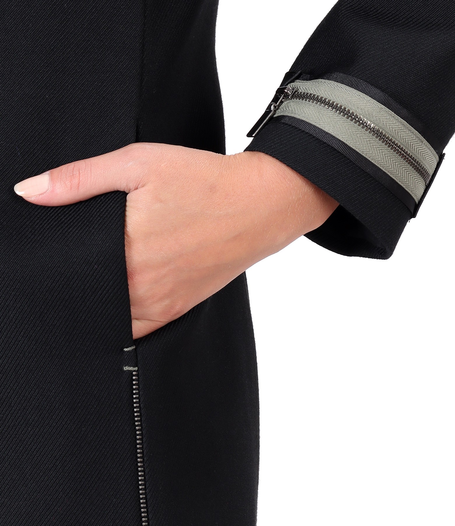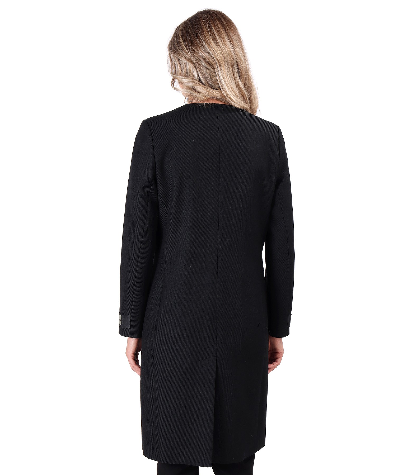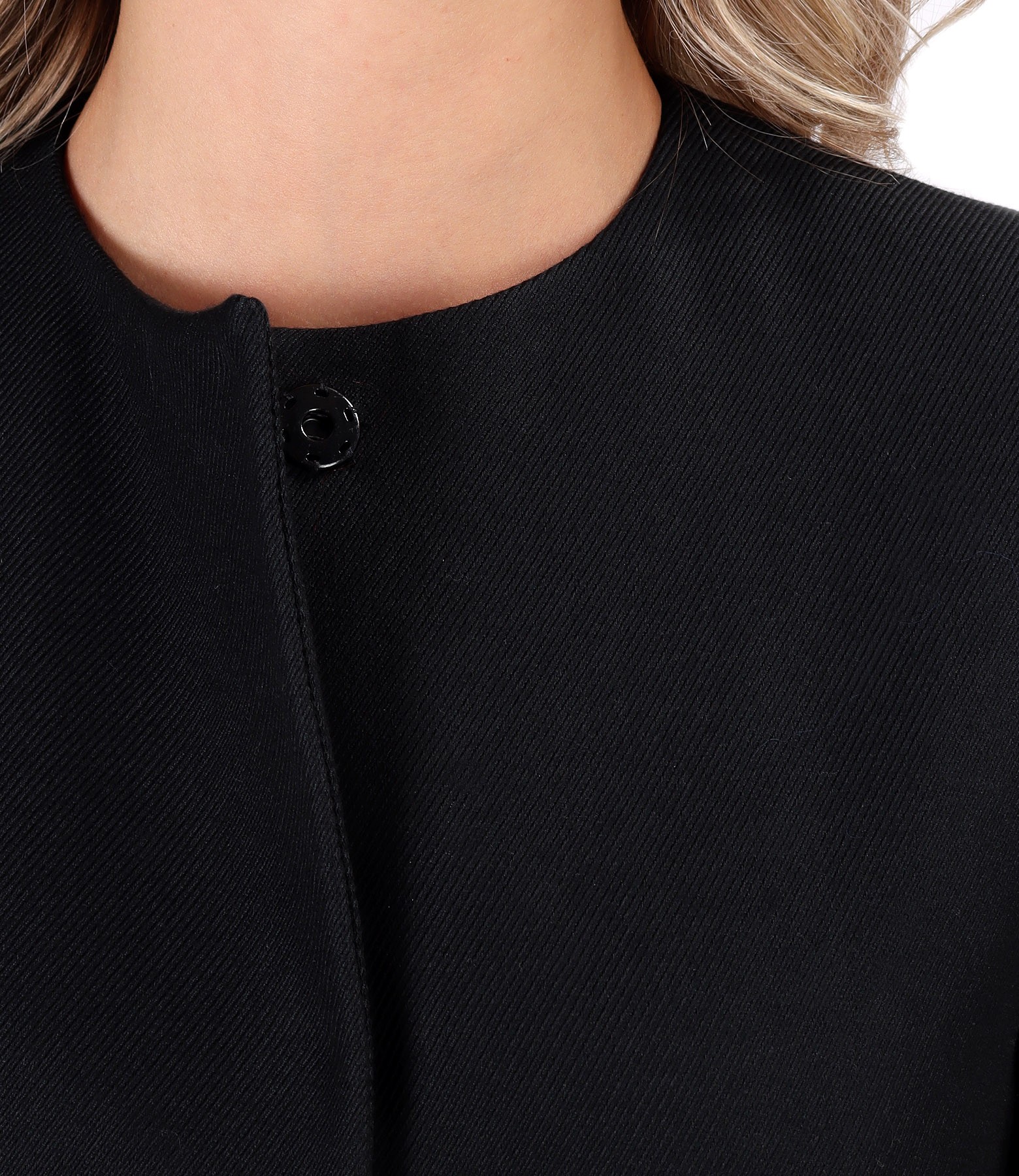 Palton elegant negru cu lana virgina si bumbac, captusit, decolteu rotund si buzunare verticale, accesorizat cu fermoare. Se inchide pe fata cu 5 capse metalice.