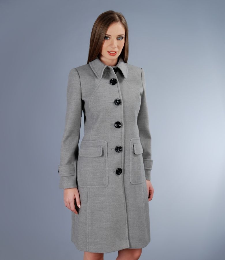Palton cu guler ascutit, buzunare patrate aplicate cu clape si maneci cu cordon inchis cu cate un nasture. Se inchide cu 6 nasturi pana la baza gatului.