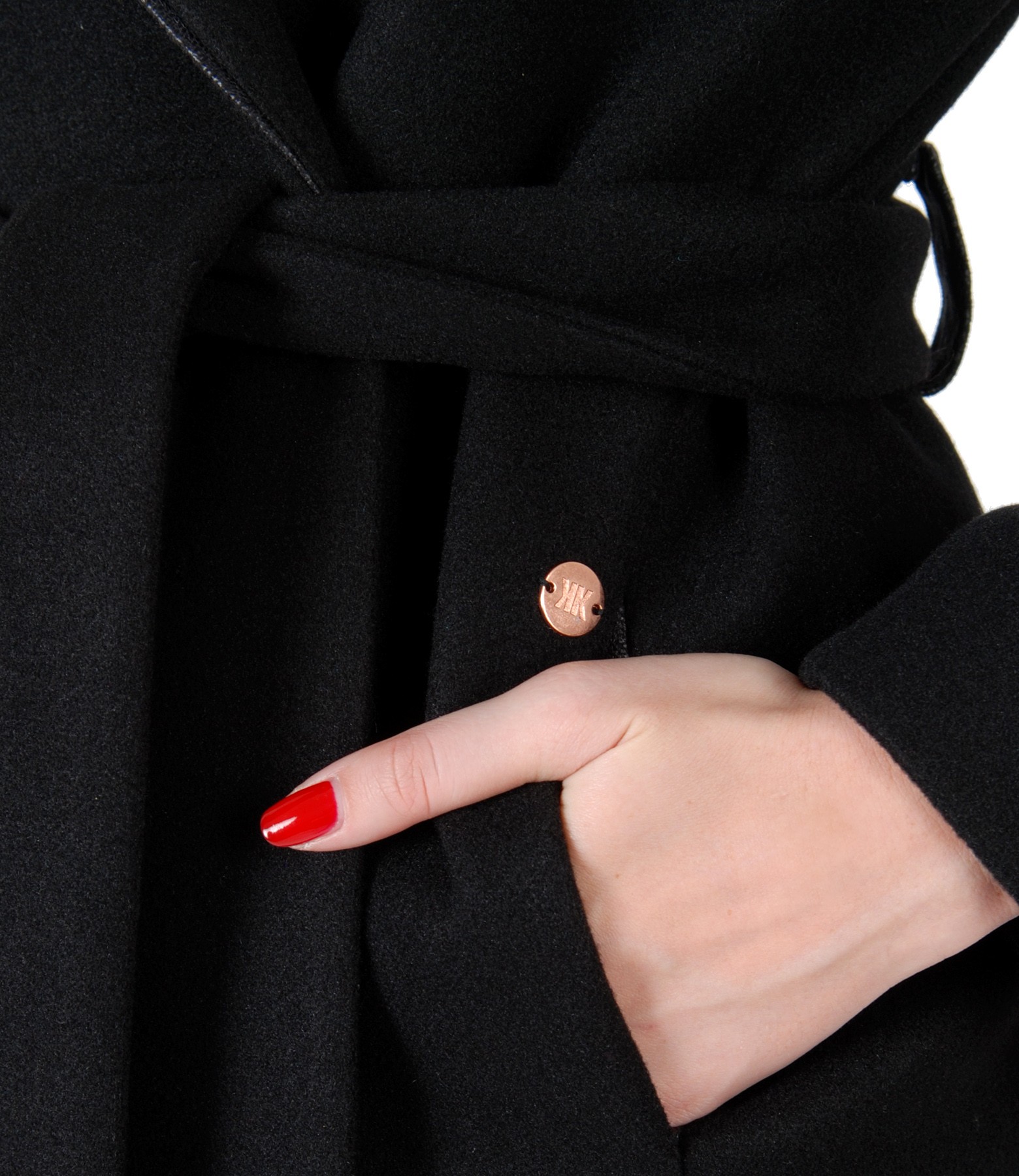 Palton fara guler din stofa elastica groasa, cu captuseala elastica, revere rasfrante cu garnitura de piele ecologica si cusaturi decorative aramii si buzunare laterale ascunse. Se inchide cu un contra-nasture si se strange in talie cu un cordon detasabil.