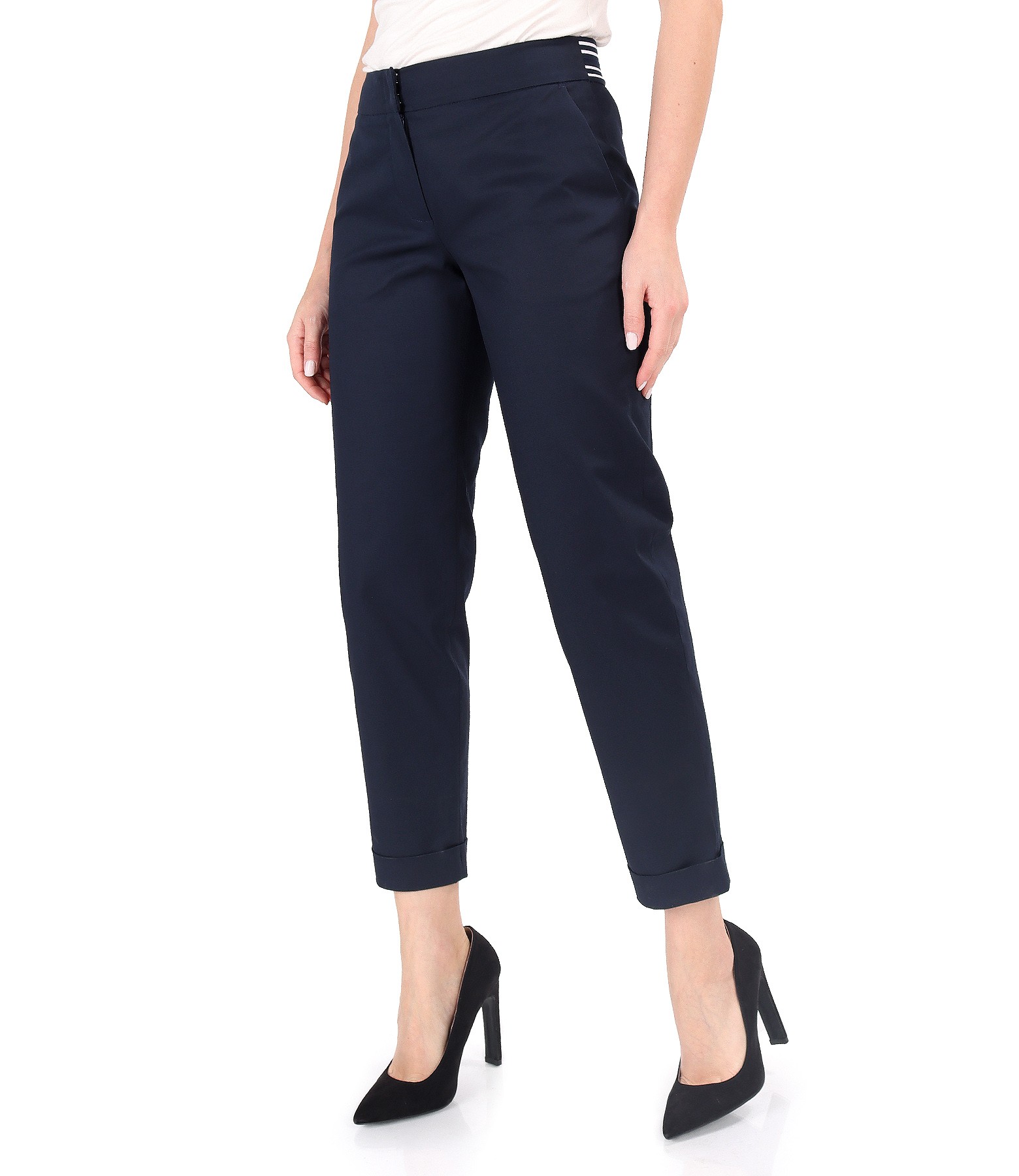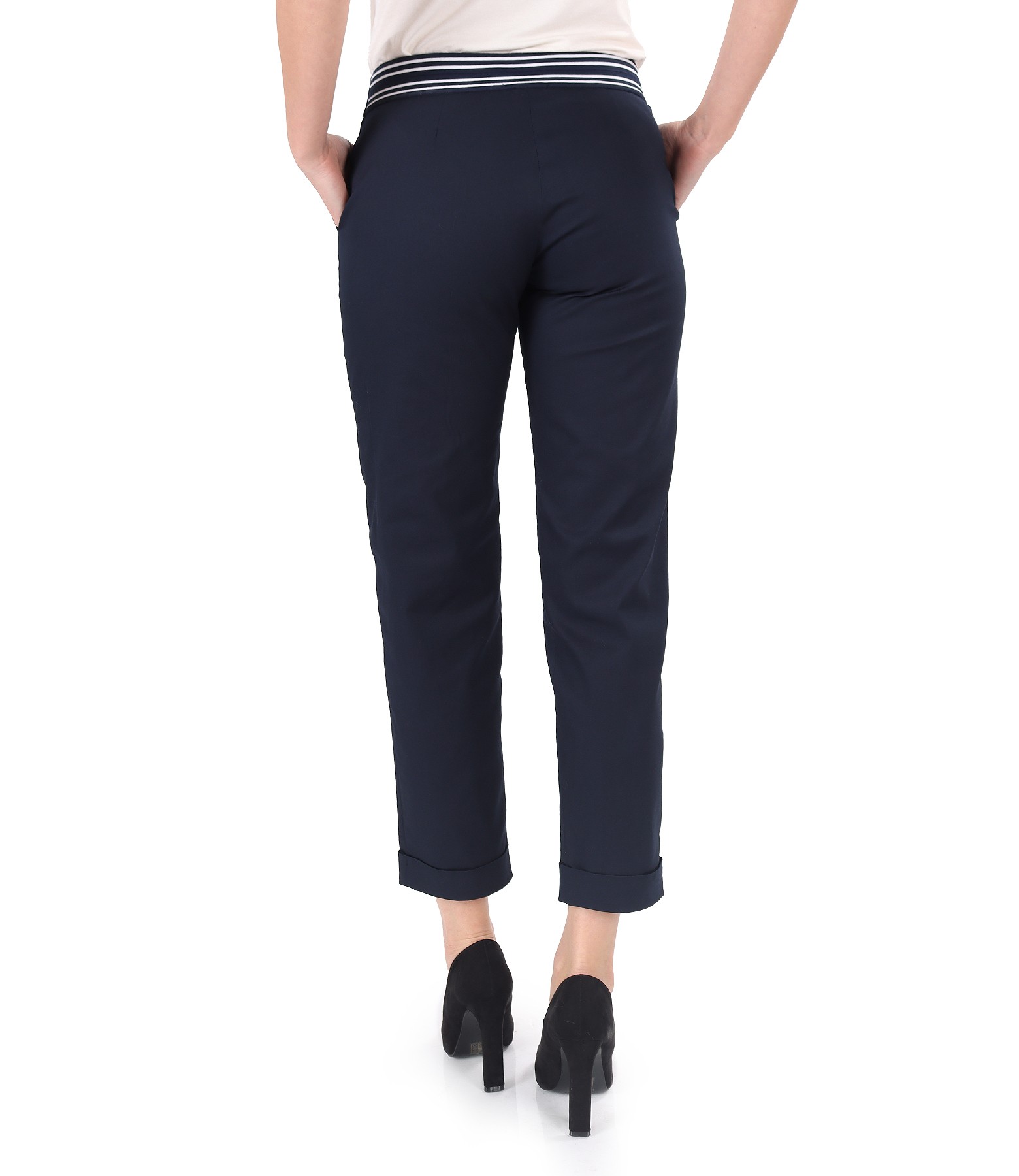 Pantaloni din bumbac elastic, cu buzunare pe fata si cu manseta la terminatie si cu elastic in talie. Se inchid cu fermoar normal, contra-nasture si 2 capse mos-baba pe fata.