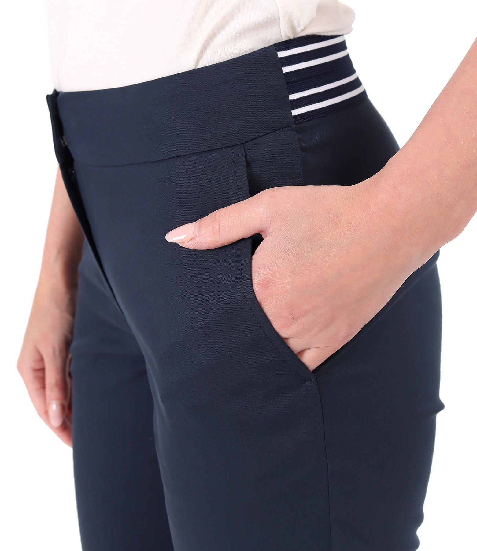 Pantaloni din bumbac elastic subtire, cu buzunare pe fata si cu manseta la terminatie si cu elastic multicolor in talie. Se inchid cu fermoar normal, contra-nasture si 2 capse mos-baba pe fata.
