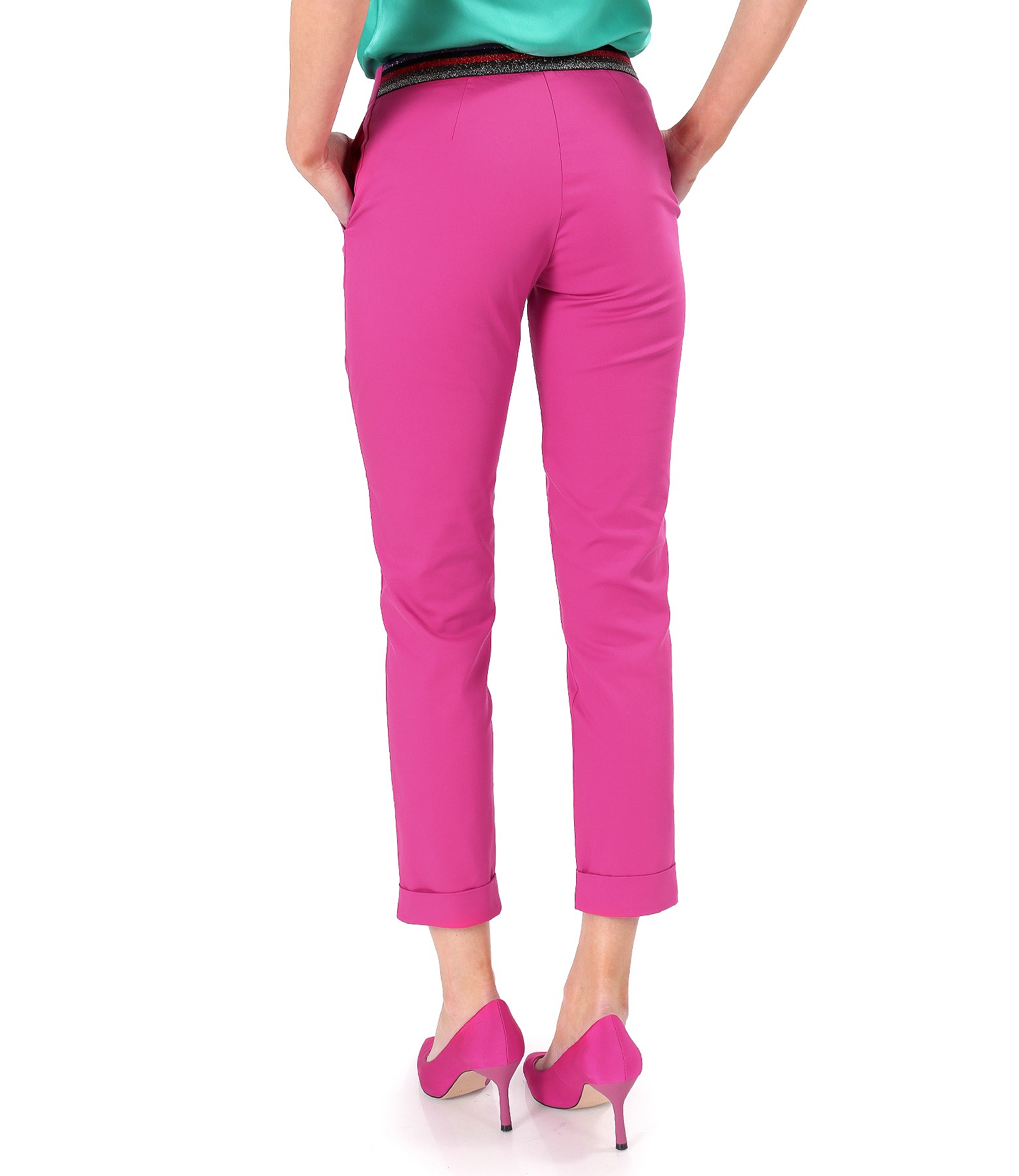 Pantaloni din bumbac elastic subtire, cu buzunare pe fata si cu manseta la terminatie si cu elastic multicolor cu fir metalizat in talie. Se inchid cu fermoar normal, contra-nasture si 2 capse mos-baba pe fata.