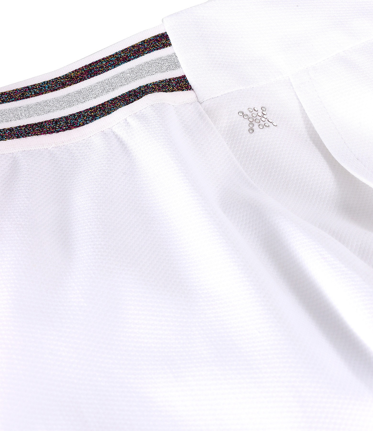 Pantaloni din bumbac texturat, cu buzunare pe fata, cu manseta la terminatie si cu elastic multicolor cu fir metalizat in talie. Se inchid cu fermoar normal, contra-nasture si 2 capse mos-baba pe fata.