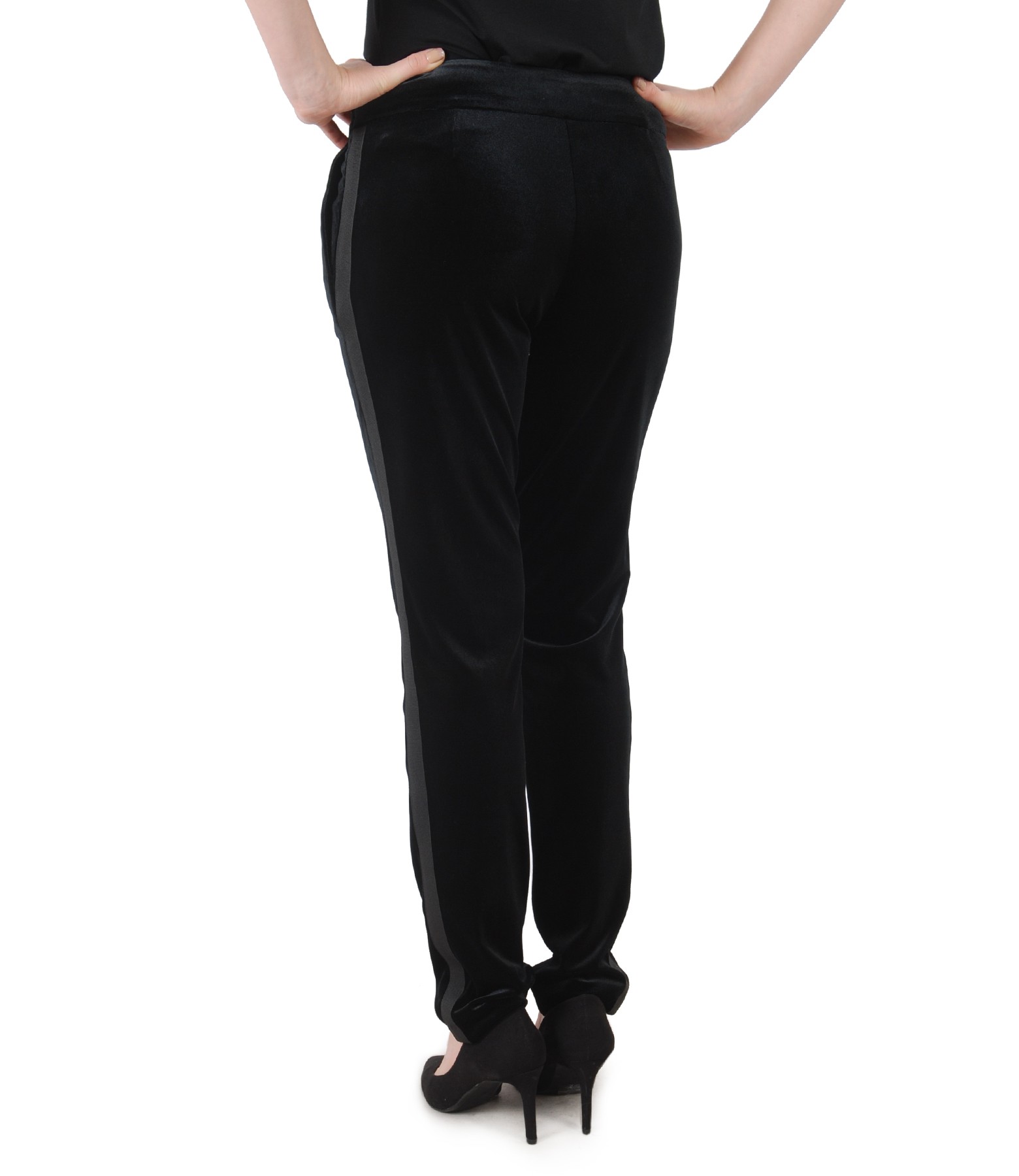 Pantaloni din catifea elastica, cu cordon in talie, falduri laterale pe fata, 2 buzunare oblice laterale si banda de rips aplicata pe lateral. Se inchid cu fermoar ascuns pe lateral stanga.