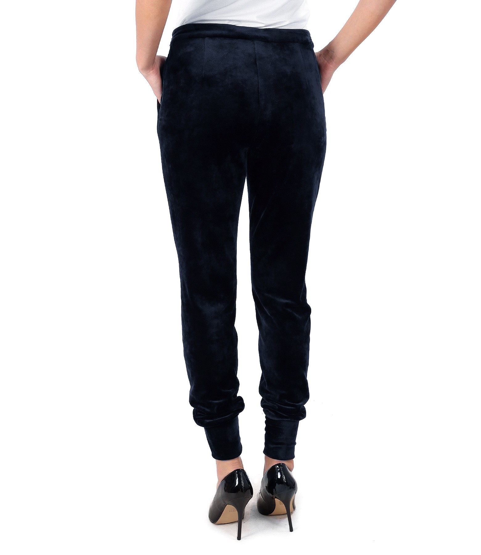 Pantaloni din catifea elastica, cu cordon in talie cu snur, falduri laterale pe fata si 2 buzunare oblice laterale. Se inchid cu fermoar ascuns pe lateral stanga.