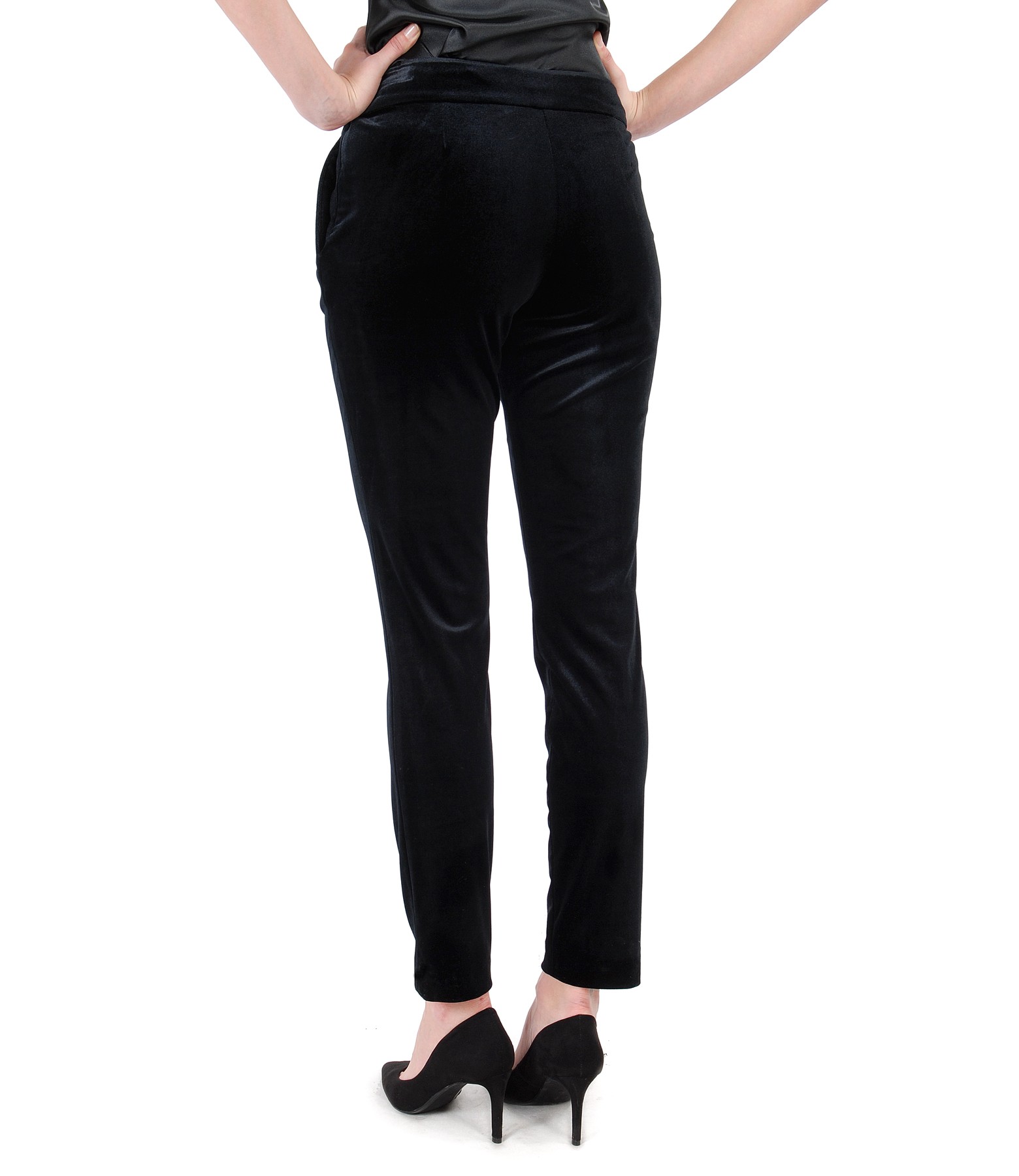 Pantaloni din catifea elastica, cu cordon in talie, falduri laterale pe fata si 2 buzunare oblice laterale. Se inchid cu fermoar ascuns pe lateral stanga.